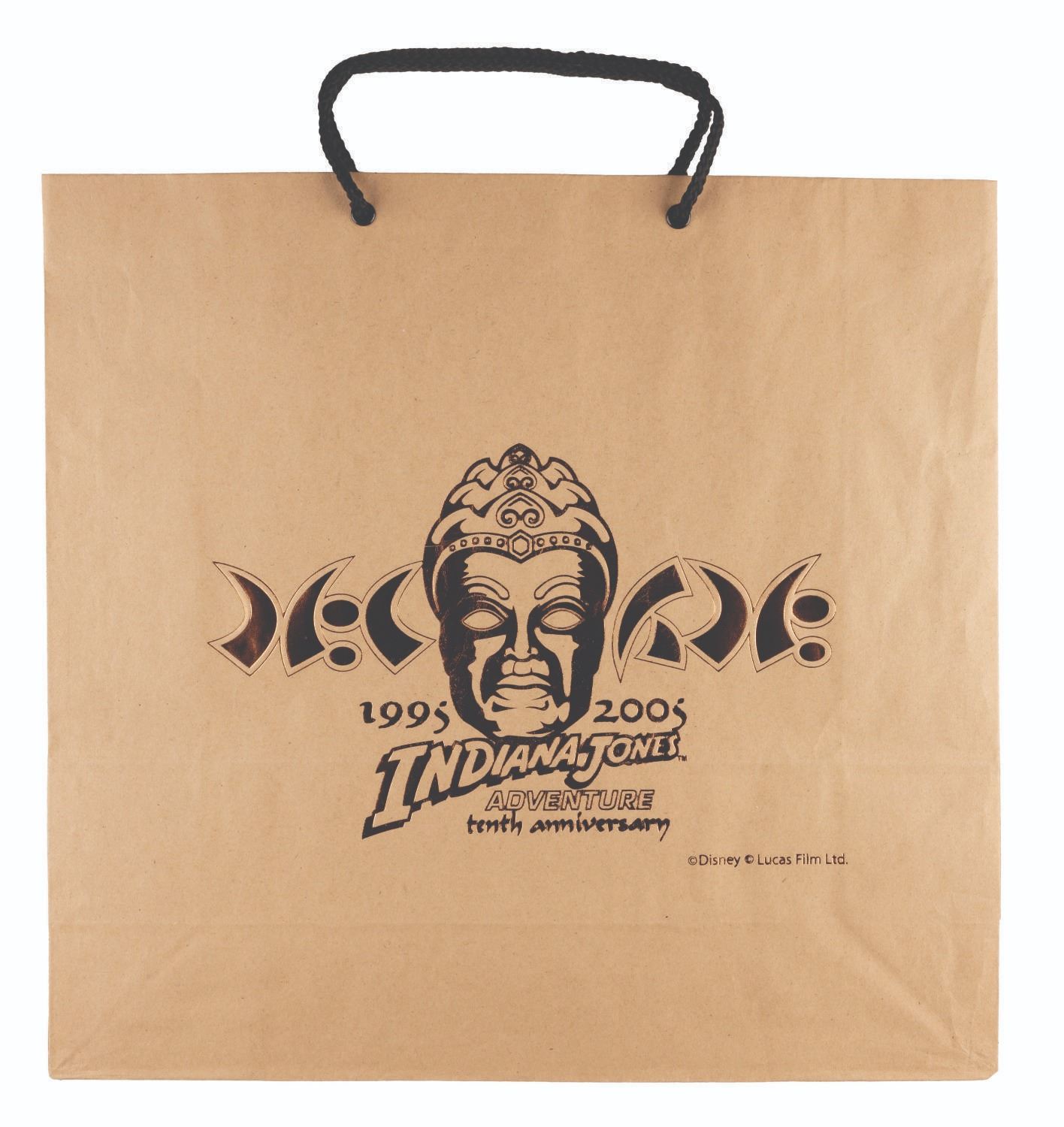 (Disneyland, 2005) A paper merchandise bag from the 10th anniversary of the Indiana Jones Adventure at Disneyland, with a golden-embossed logo. Measuring 18” x 17”, the bag is in fine condition.