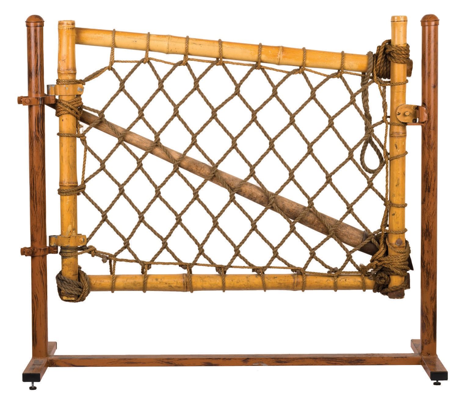 (Disneyland, 1995) An original walk-through entry gate to the Indiana Jones Adventure attraction. This gate was used during the attraction's opening year in 1995 and was later removed when height codes were changed. Constructed of wood, metal, and rope, the gate measures 32.5"x45" and is in very good condition with expected wear from park use. The gate has been mounted for display to a custom stand measuring 33"x42.5"x5.5" thick. Due to size and weight, special shipping arrangements are required. Please inquire before bidding.