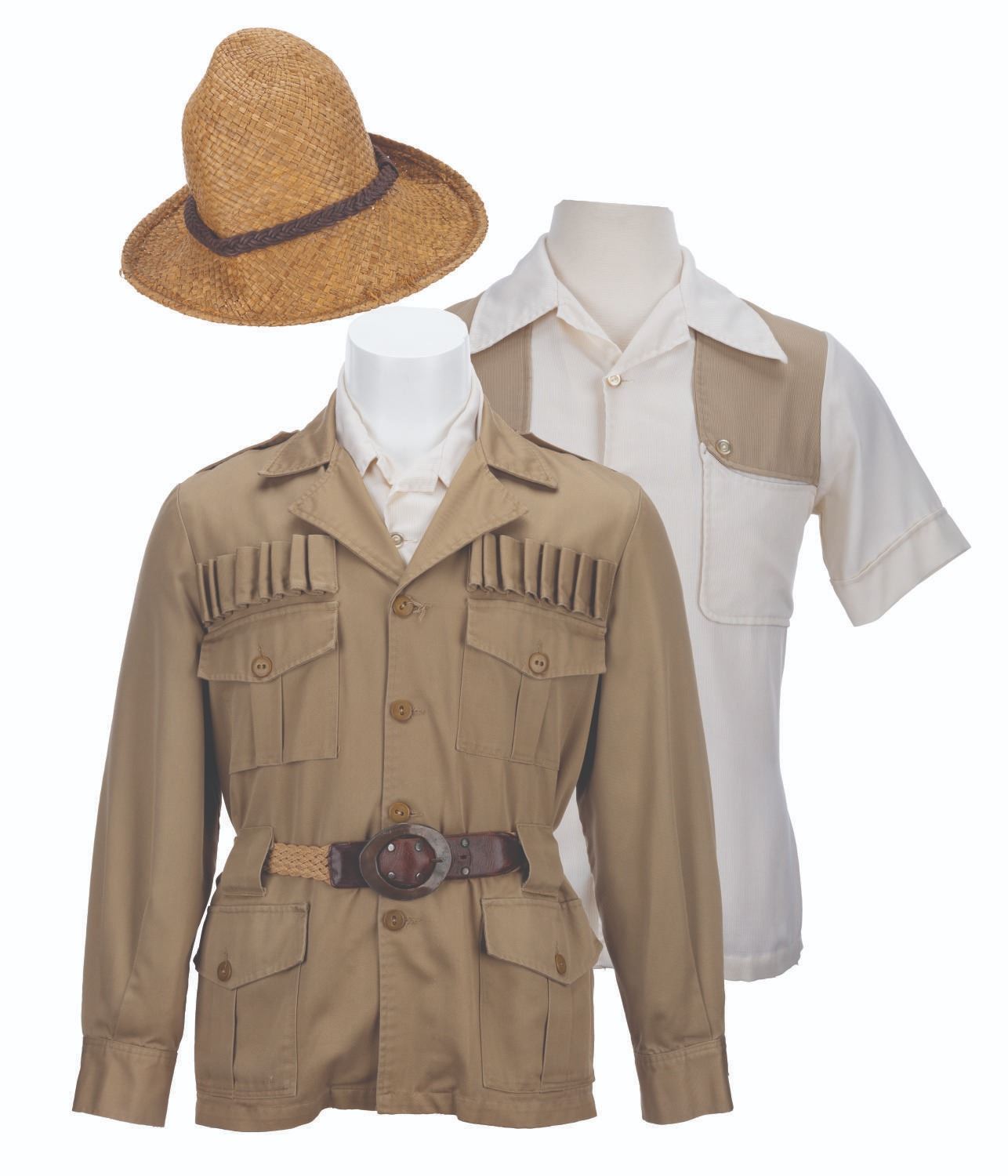 (Disneyland, 1990-2020s) A costume worn by a Cast Member working at the Indiana Jones Adventure attraction at Disneyland. Included are a jacket, shirt, and a hat, each with the original Disney Wardrobe tags. The jacket is labeled a size 38, the shirt "M", and the hat a unisex "2XL", each piece displays in good, Park-used condition. The jacket has two small holes to the front pockets, fraying around the button holes, and light scratches to the belt buckle. The hat displays adhesive residue from areas where the band has detached, and it does not retain its original shape.