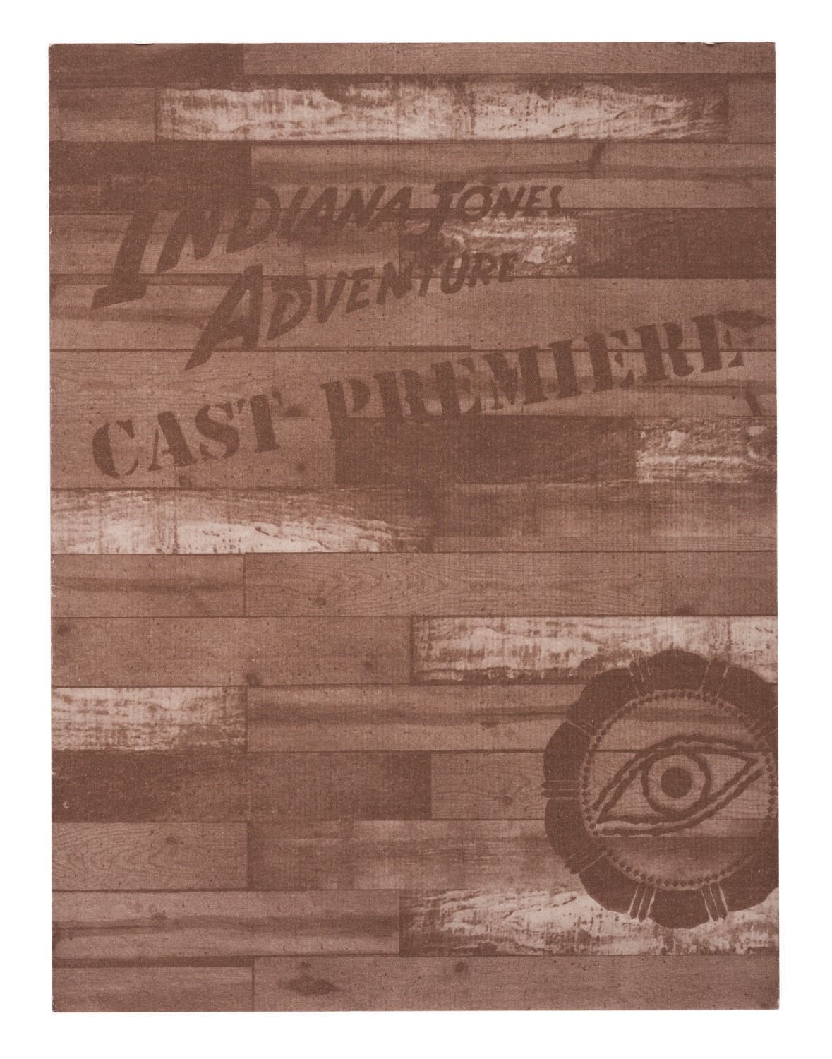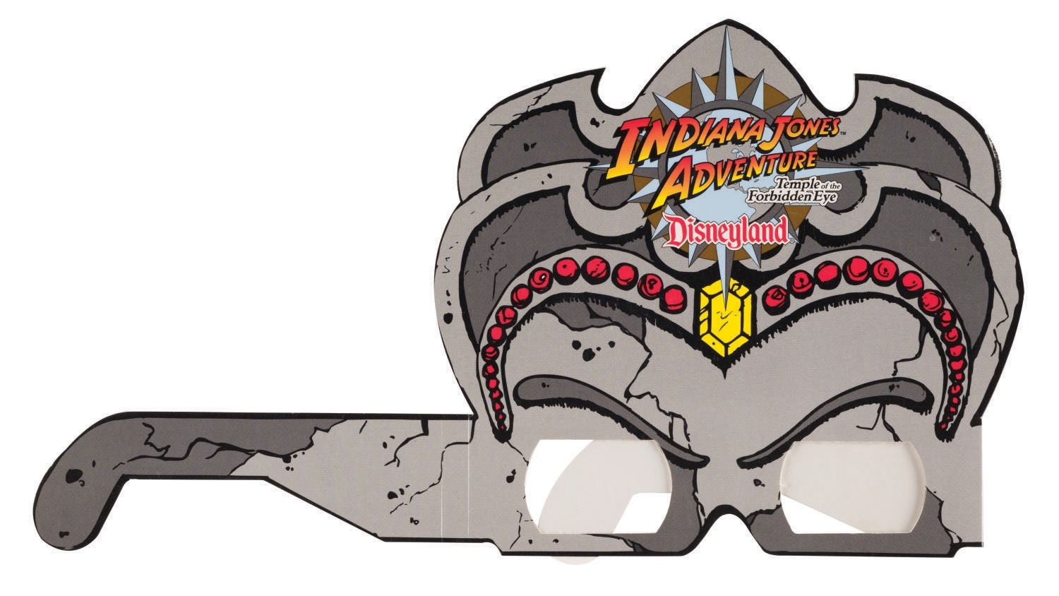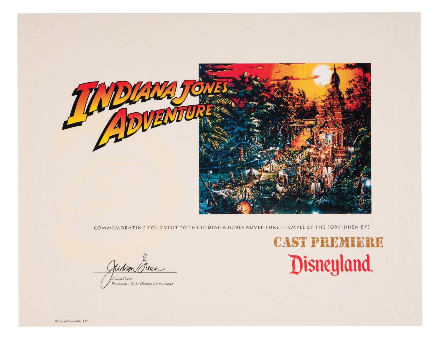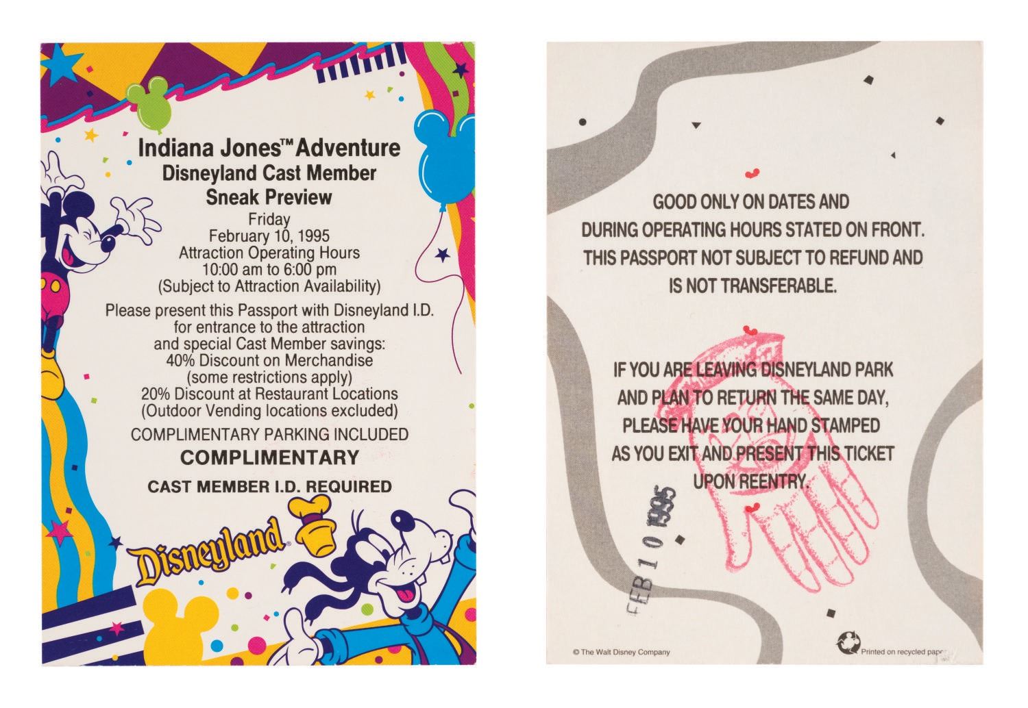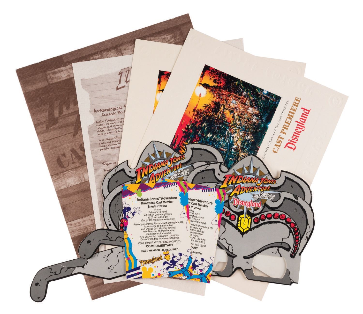 (Disneyland, 1995) An Indiana Jones and the Temple of the Forbidden Eye cast member collection including (1) Indiana Jones Adventure Cast Premiere Packet with an archeological findings fact sheet, (2) cast premiere commemorative certificates, (2) cast member tickets, (2) large pinback buttons, (2) pairs of 3D glasses, and (1) unopened wax pack of Temple of Doom Topps trading cards. Measuring various sizes up to the 9"x12" portfolio, all items are in fine condition, with one crease to one pair of glasses.