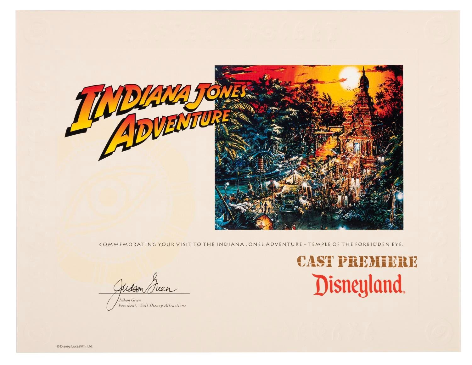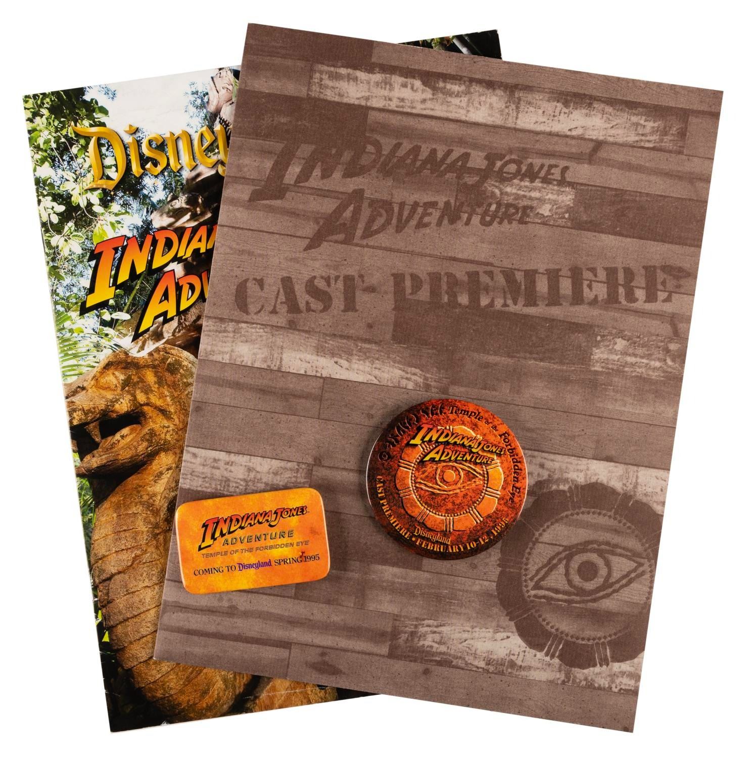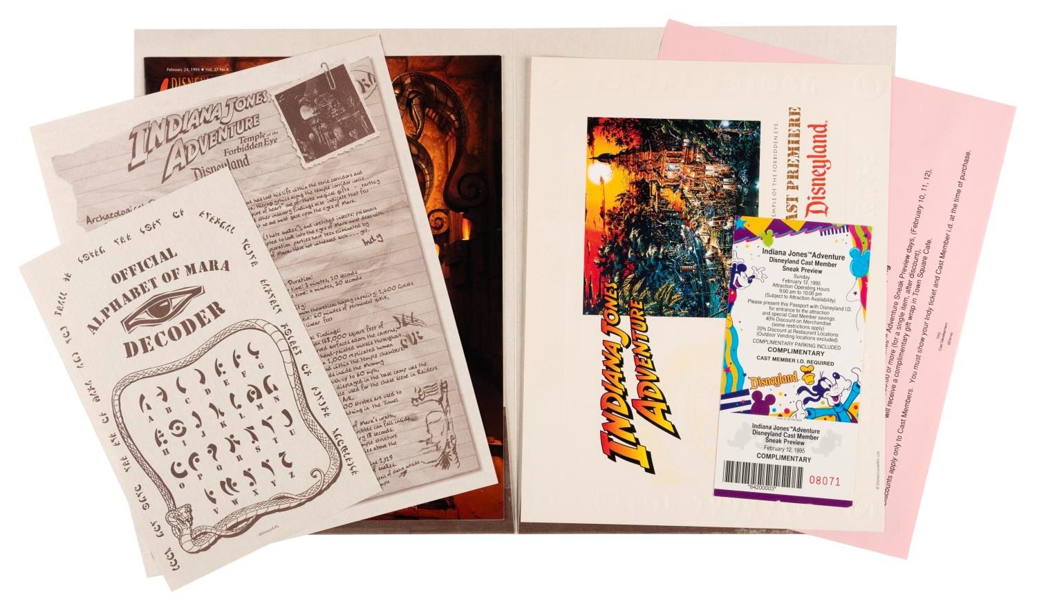 (Disneyland, 1995-2010) An Indiana Jones and the Temple of the Forbidden Eye cast member collection including one Indiana Jones Adventure Cast Premiere Packet with an archeological findings fact sheet and an alphabet of Mara decoder sheet, one Cast Member commemorative certificate, one Cast Member sneak preview ticket, two pinback buttons, and a copy of "Disneyland Line" magazine from December 2010 celebrating the 15th anniversary of the attraction. Measuring various sizes up to the 9"x12" folder, all items are in fine condition except for the "Disneyland Line" magazine which is in good condition with a postage sticker on the cover, a light horizontal fold that runs through the book, and edge wear and creases throughout.