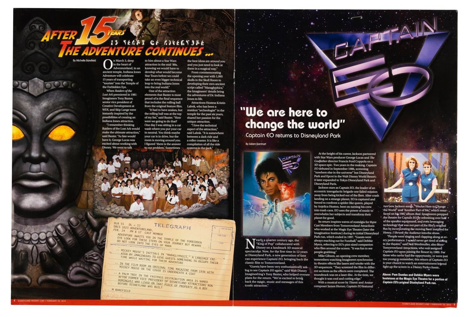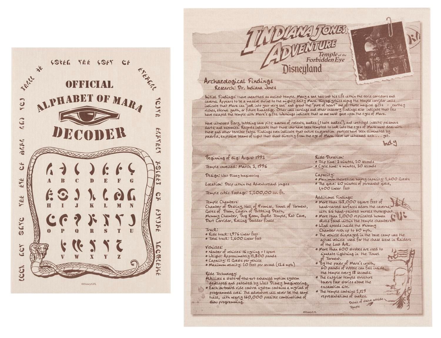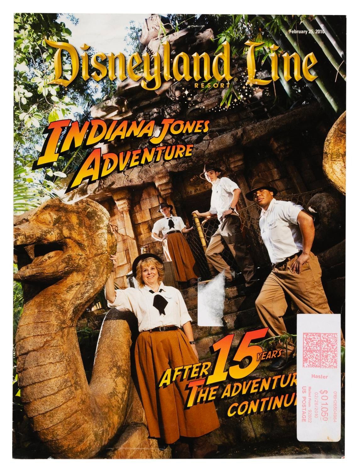 (Disneyland, 1995-2010) An Indiana Jones and the Temple of the Forbidden Eye cast member collection including one Indiana Jones Adventure Cast Premiere Packet with an archeological findings fact sheet and an alphabet of Mara decoder sheet, one Cast Member commemorative certificate, one Cast Member sneak preview ticket, two pinback buttons, and a copy of "Disneyland Line" magazine from December 2010 celebrating the 15th anniversary of the attraction. Measuring various sizes up to the 9"x12" folder, all items are in fine condition except for the "Disneyland Line" magazine which is in good condition with a postage sticker on the cover, a light horizontal fold that runs through the book, and edge wear and creases throughout.