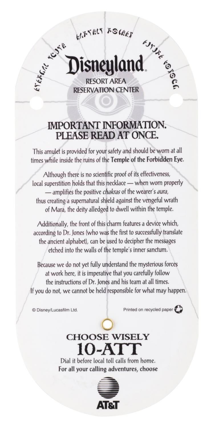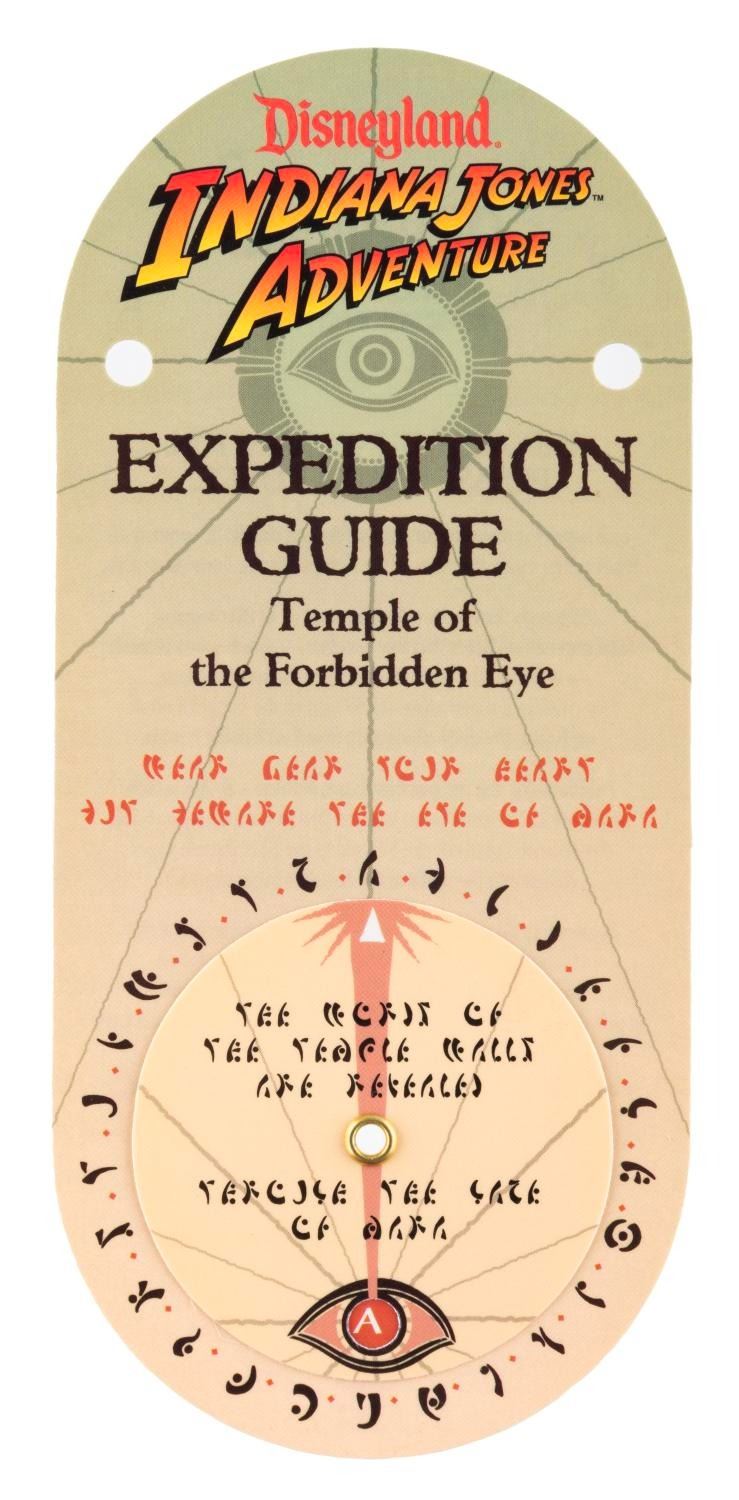 (Disneyland, 1995) An Indiana Jones Adventure Expedition Guide for the Temple of the Forbidden Eye opening at Disneyland. The guide features a rotating wheel alphabet translator for use in the attraction's queue with important Temple information and the AT&T logo on the reverse. AT&T sponsored the beloved attraction for its first seven years of operation. Measuring 3.5” x 7.5”, the guide is in very good condition with light scuffs, scratches, and edge wear.