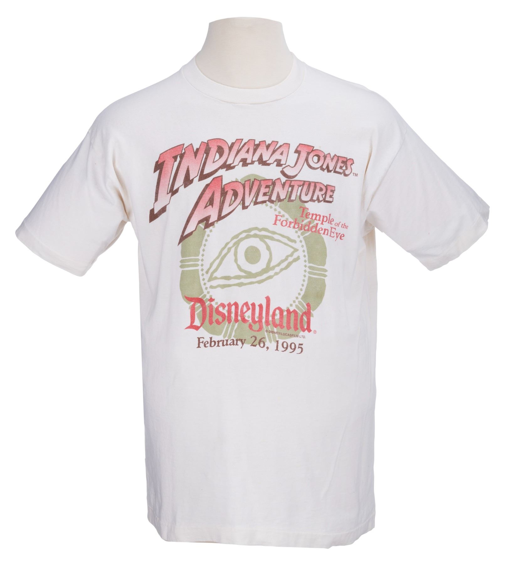 (Disneyland, 1995) A commemorative T-shirt from an Indiana Jones Adventure media event held on February 26, 1995, prior to the ride’s opening to the general public. Labeled a size XL, the shirt displays in very good condition with light stains and discoloration from age.