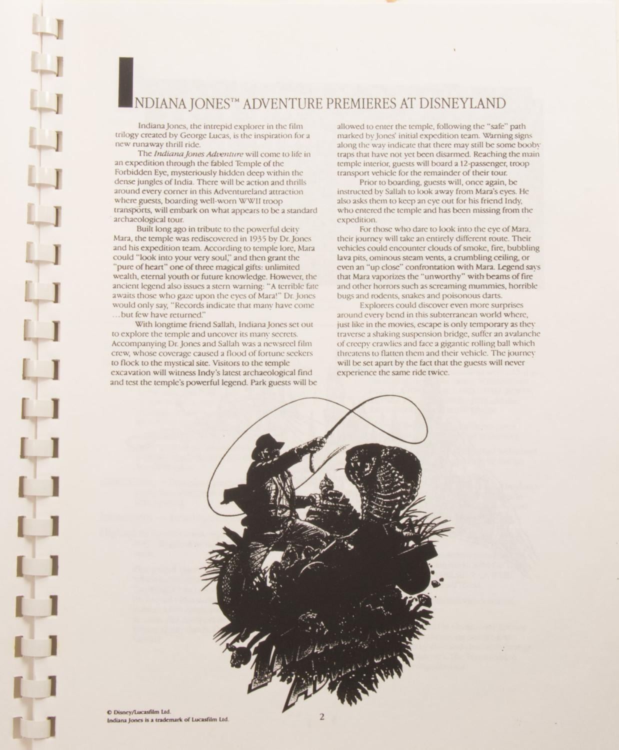 (Disneyland, 1995) A xeroxed copy of the press book provided to media outlets ahead of the opening of Indiana Jones Adventure: Temple of the Forbidden Eye. Measuring 8.75” x 11.25”, the 36-page spiral-bound book is in good condition with surface scratches and inscriptions inside.