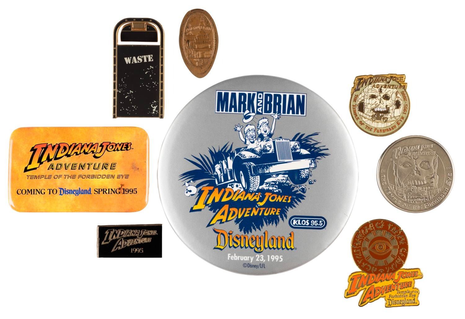 (Disneyland, 1990s) A collection of eight souvenirs from Indiana Jones Adventure: Temple of the Forbidden Eye. Included are a Mark and Brian button, a “Coming in Spring 1995” button, a pressed penny, a pewter medallion, and four pins including a Disneyland Cast Member exclusive and an Imagineering Limited Edition 300 Trash can. Measuring from 1.25” to 4” in diameter, the collectibles are overall in very good condition with some light handling wear.