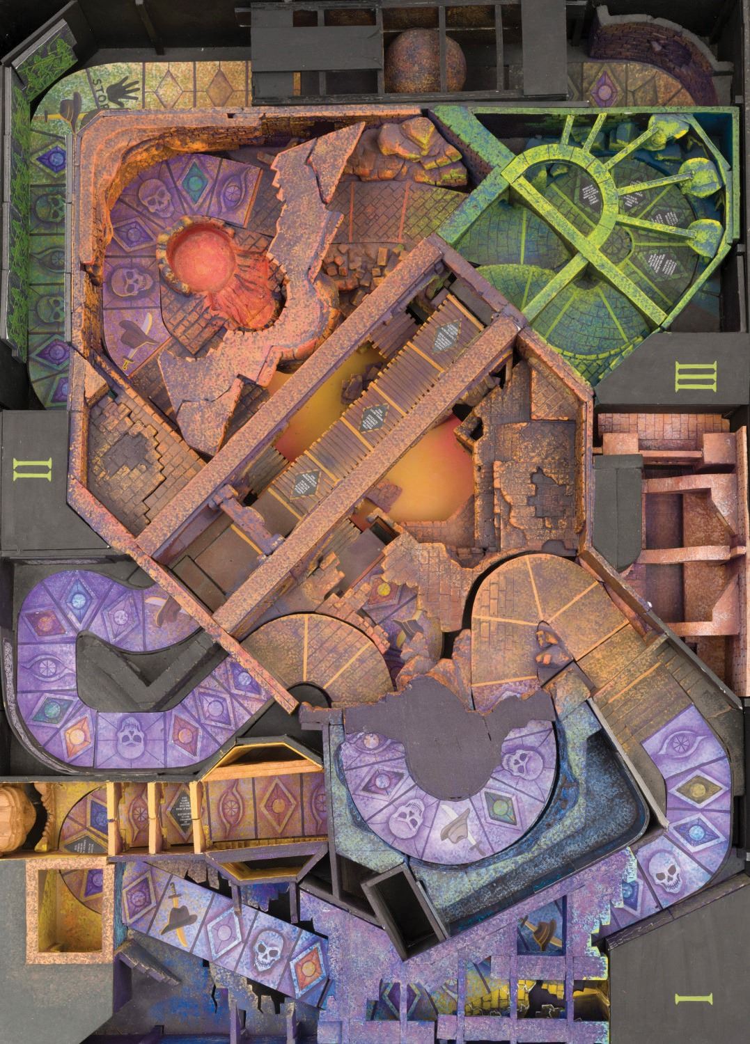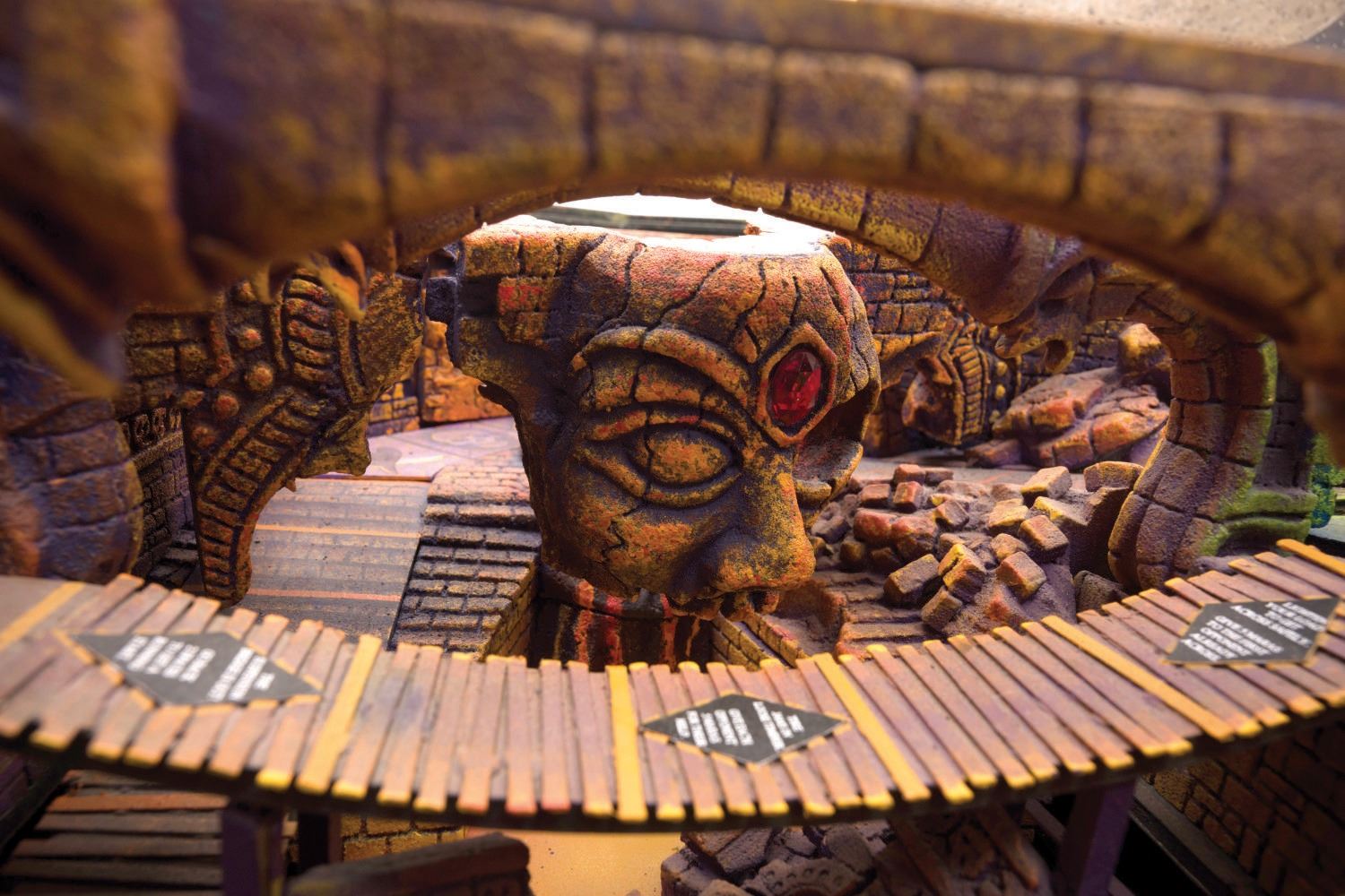 (Disney, 1990s) An incredibly rare Imagineers' model for the Indiana Jones Temple of the Forbidden Eye Imagineering Model. With its patented ride system, 0.5-mile queue area and 50,000-square-foot show area, the "Indiana Jones Adventure: Temple Of The Forbidden Eye" was a groundbreaking ride for the Disneyland parks. 400 Imagineers worked on the project led by Tony Baxter and his key team including Imagineer John Stone. Stone hand-built this incredibly detailed, one-of-a-kind, 28"x 46" x 10" miniature model so that the Imagineering crew could time the ride and coordinate movements and actions. An animatic, virtual "walk-through" of the ride was filmed using this model. The impressive model is expertly constructed of wood, resin, and foam core elements and realistically hand-painted to appear as the interior of an ancient and cavernous stone temple. All the important features of the attraction are present, from the rope bridge to the gigantic rolling boulder. There are moving parts as well as modular sections of the model that can be removed. Stone later took the model home and painted and finished it for display and that is how it has survived. Subsequently, Stone added elements and markers to the model, making it an actual, functioning board game. Cards and game pieces are included. Imagineering models of Disney rides rarely if ever show up for public sale. In very fine condition. This piece requires special shipping arrangements. Please inquire before bidding.