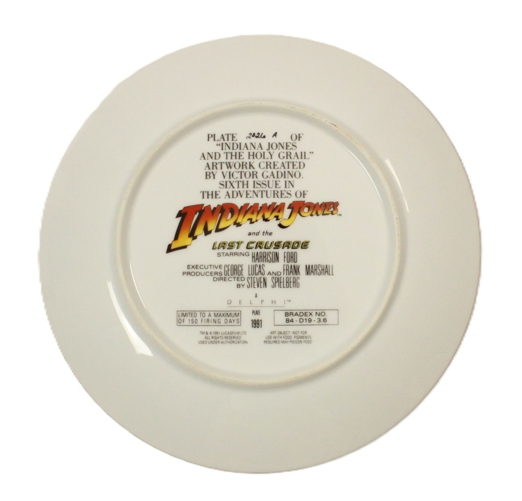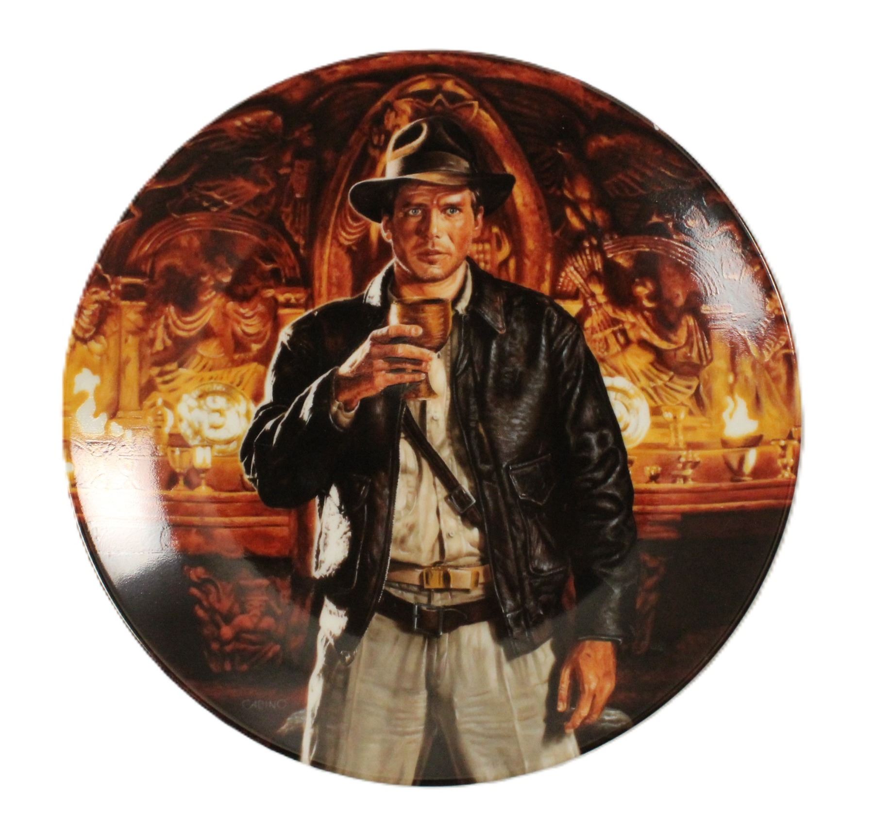 (Bradford Exchange, 1991) This is a limited edition (2026 A) masterpiece created by artist Victor Gadino. This plate features an iconic scene from Indiana Jones and the Last Crusade. It is in fine condition with one edge chip and measures 8.5" across.
