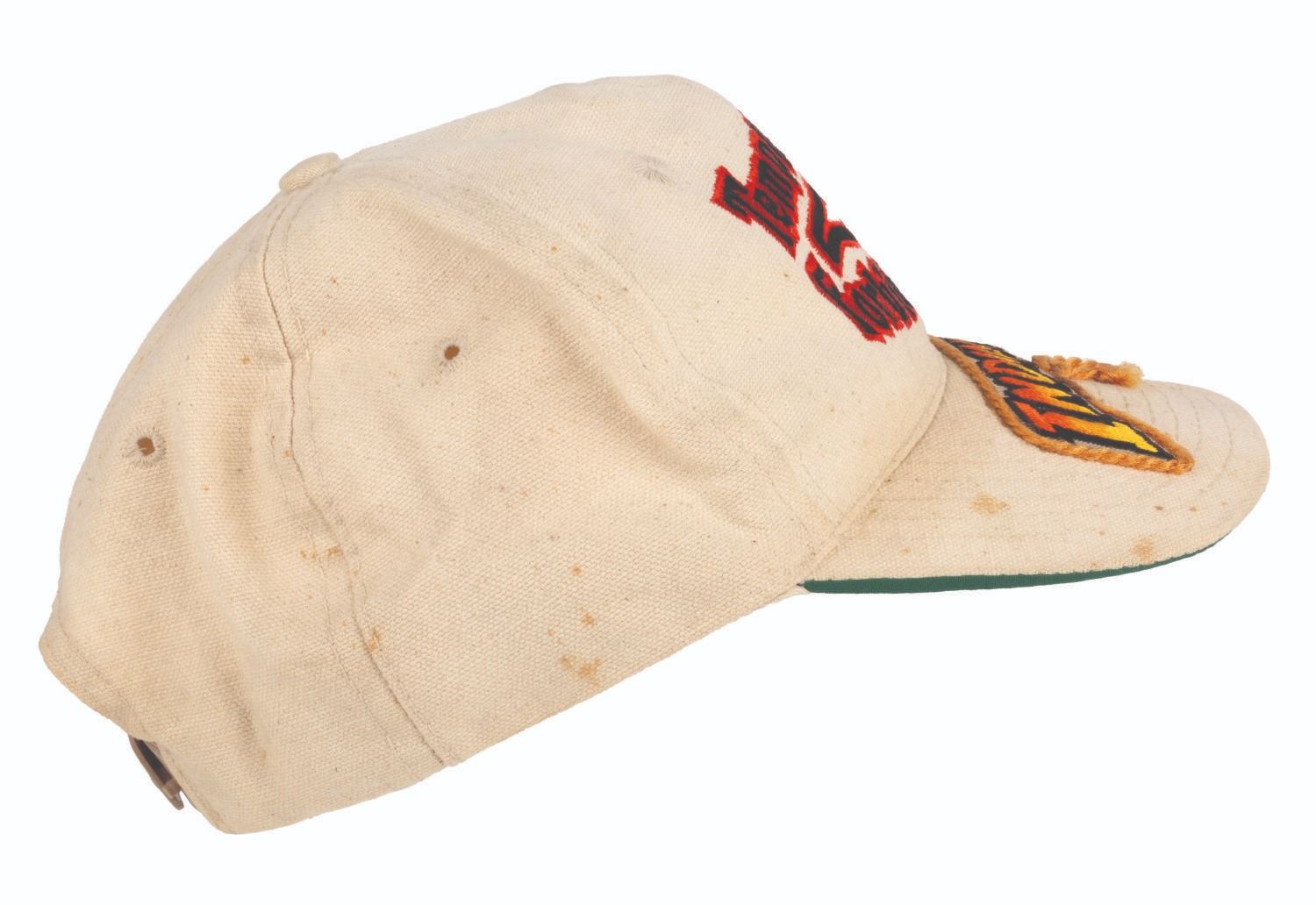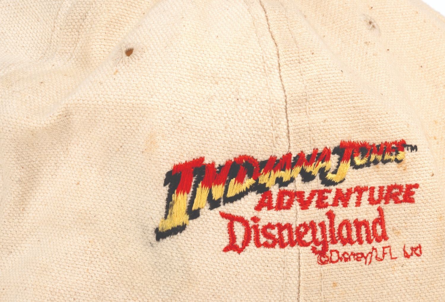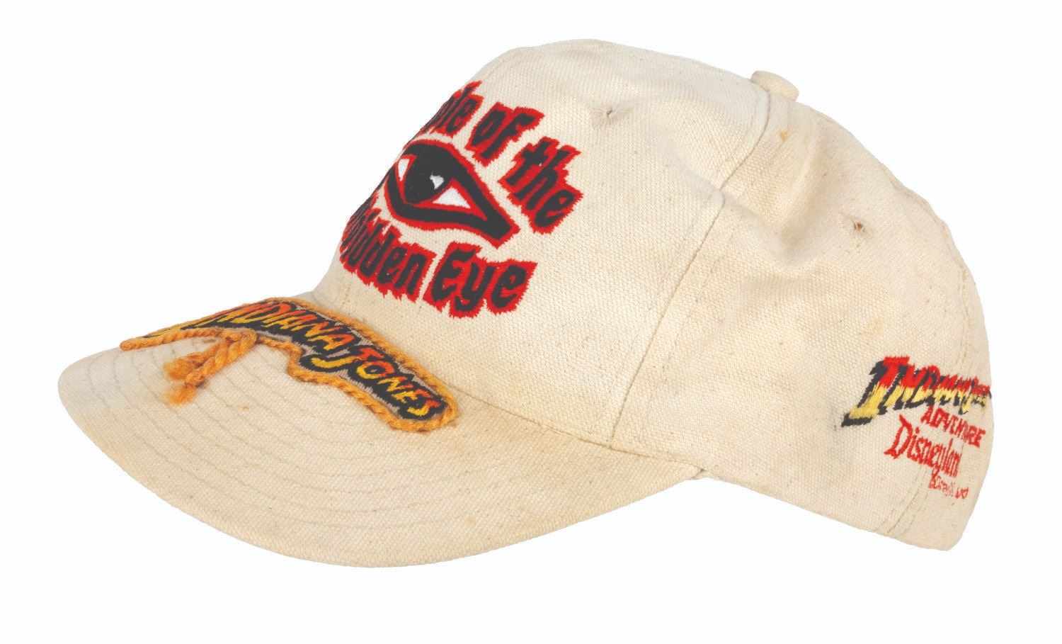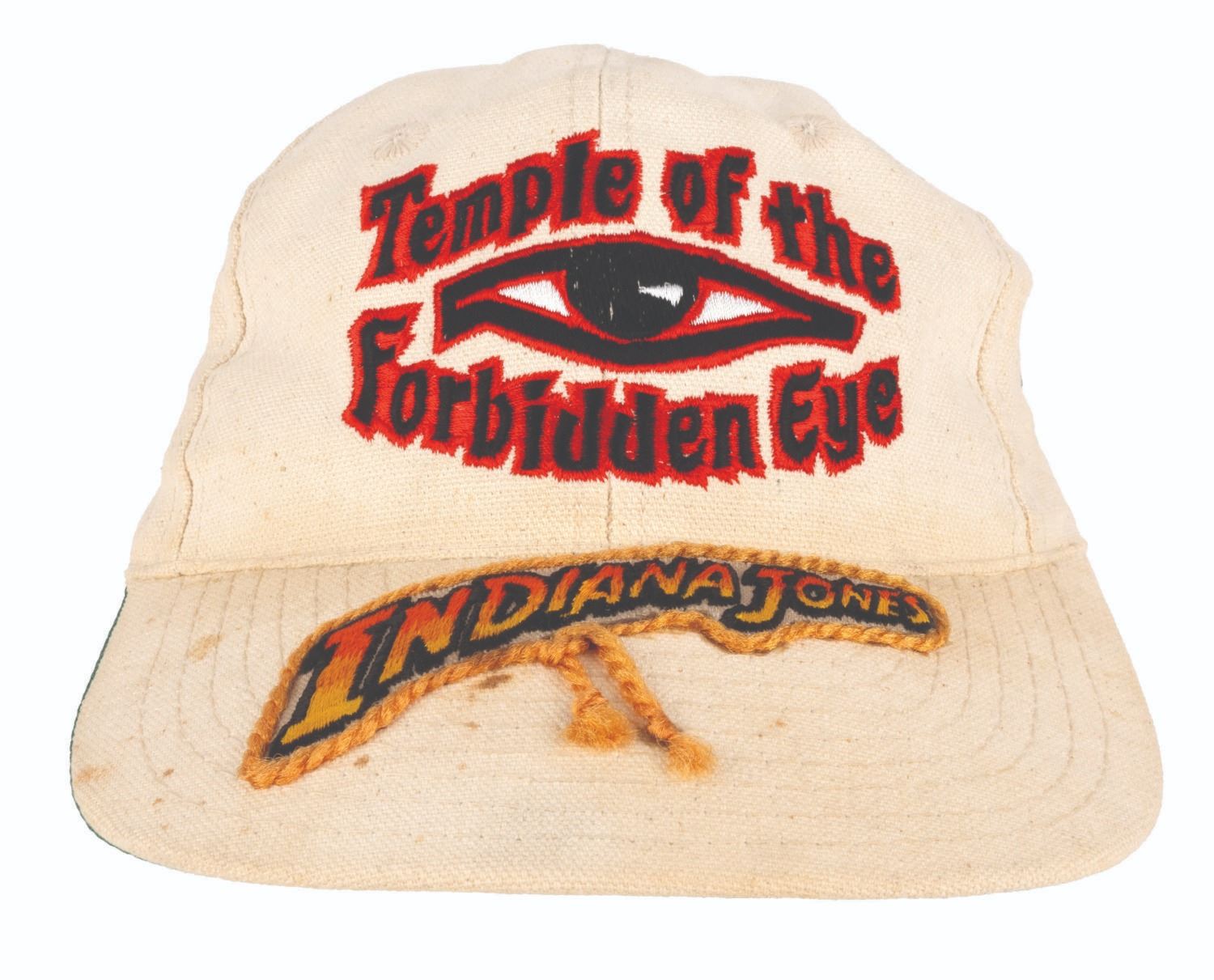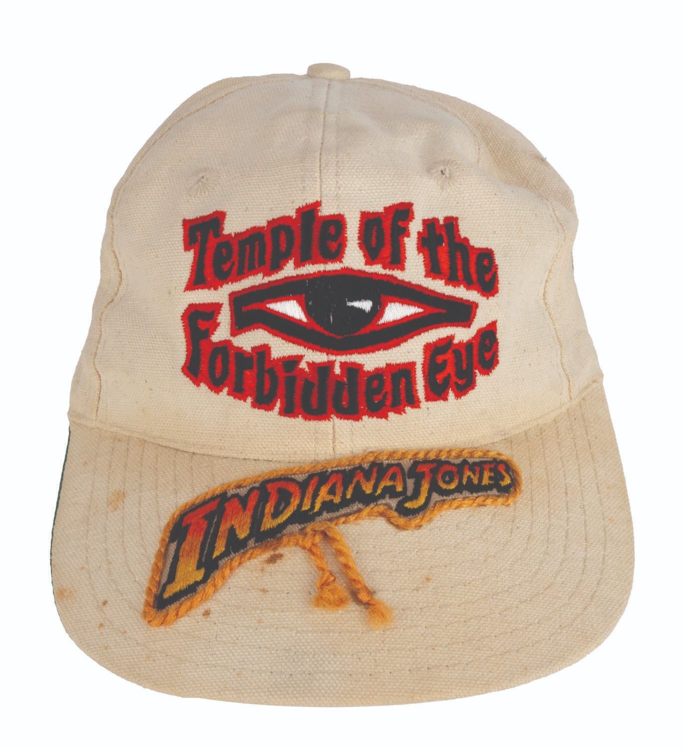 (Disneyland, 1990s) An embroidered baseball hat for Indiana Jones Adventure: Temple of the Forbidden Eye. Measuring one size fits most with an adjustable plastic strap, the hat is in fair condition with spotting throughout and stains inside from use.