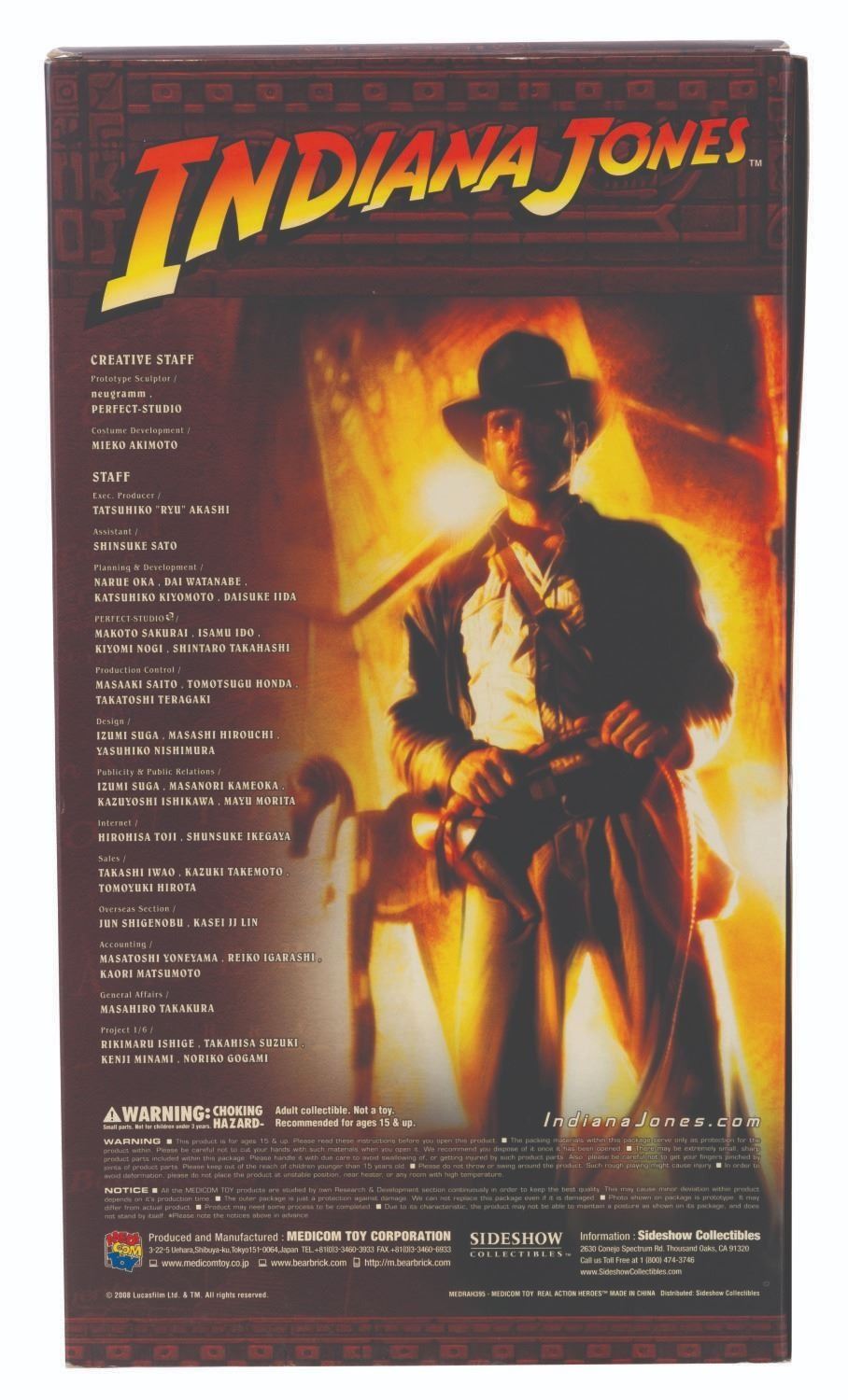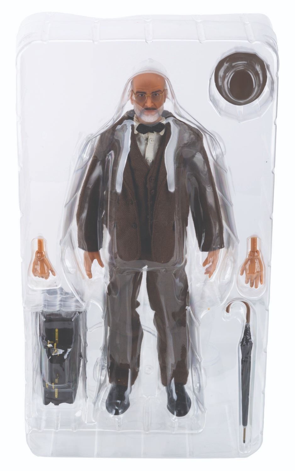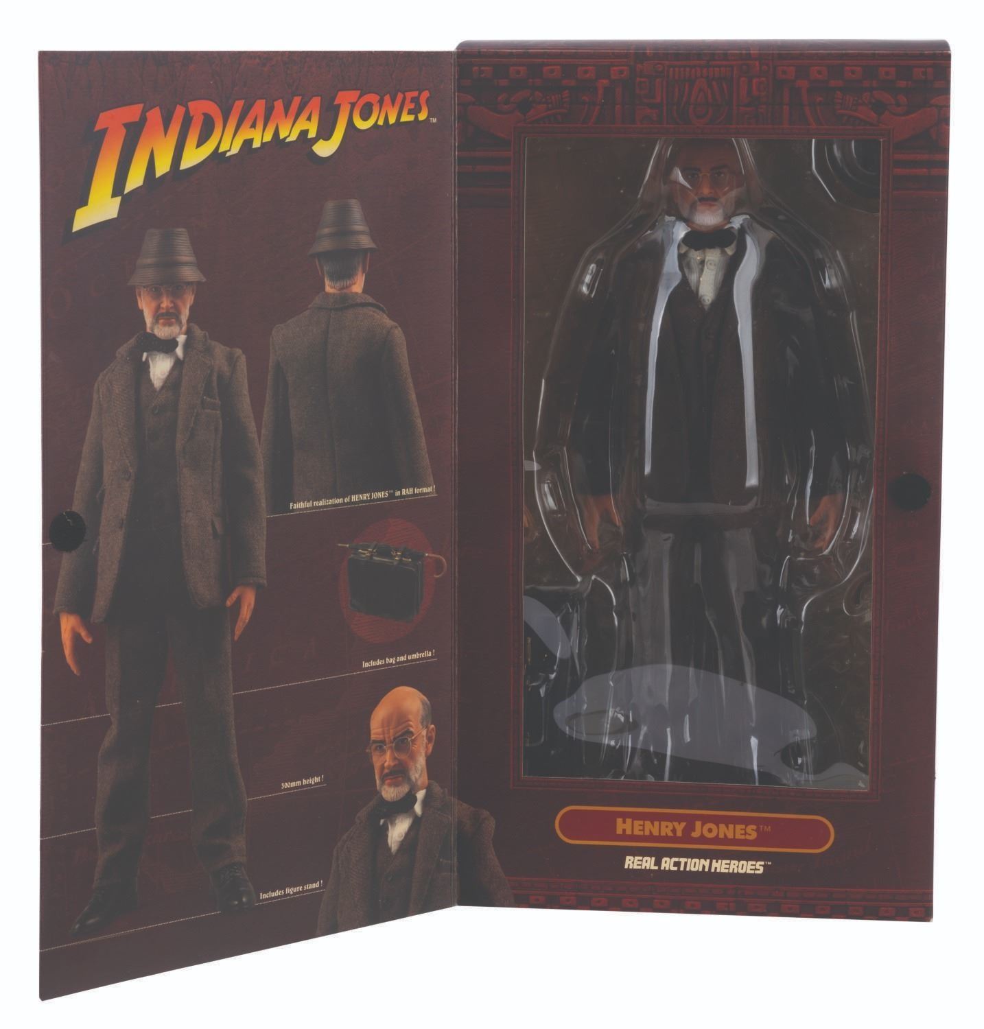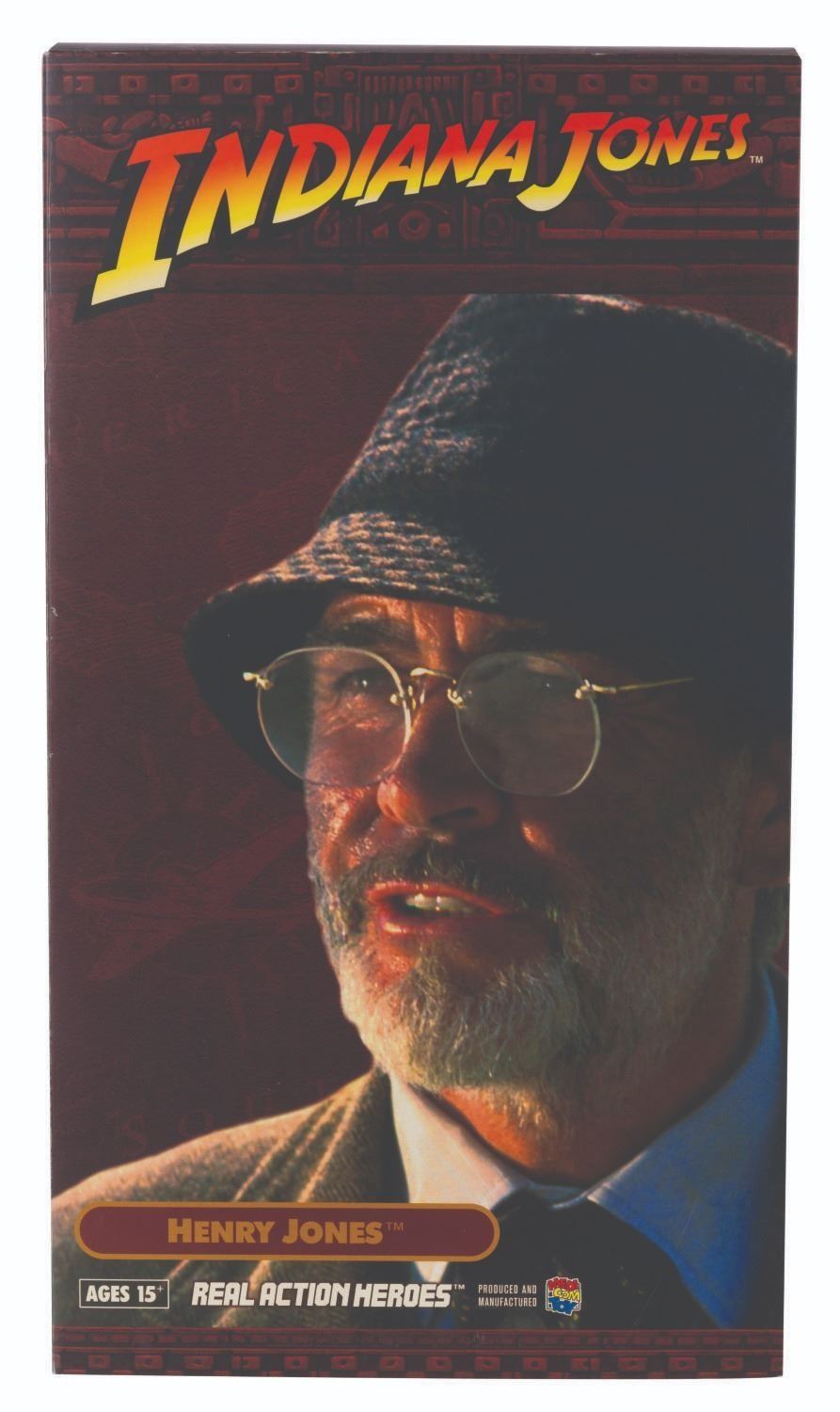 (Medicom Toy, 2008) A Real Action Heroes 1/6 scale figure of Sean Connery as Henry Jones Sr. in “Indiana Jones and the Last Crusade.” The detailed figure by Medicom Toy includes a figure stand, hat, and bag with an umbrella. Measuring 12” tall in its 8” x 3.5” x 14” tall original box, the unopened figure and accessories are in fine condition, while the box is in good condition with scratches and wear.
