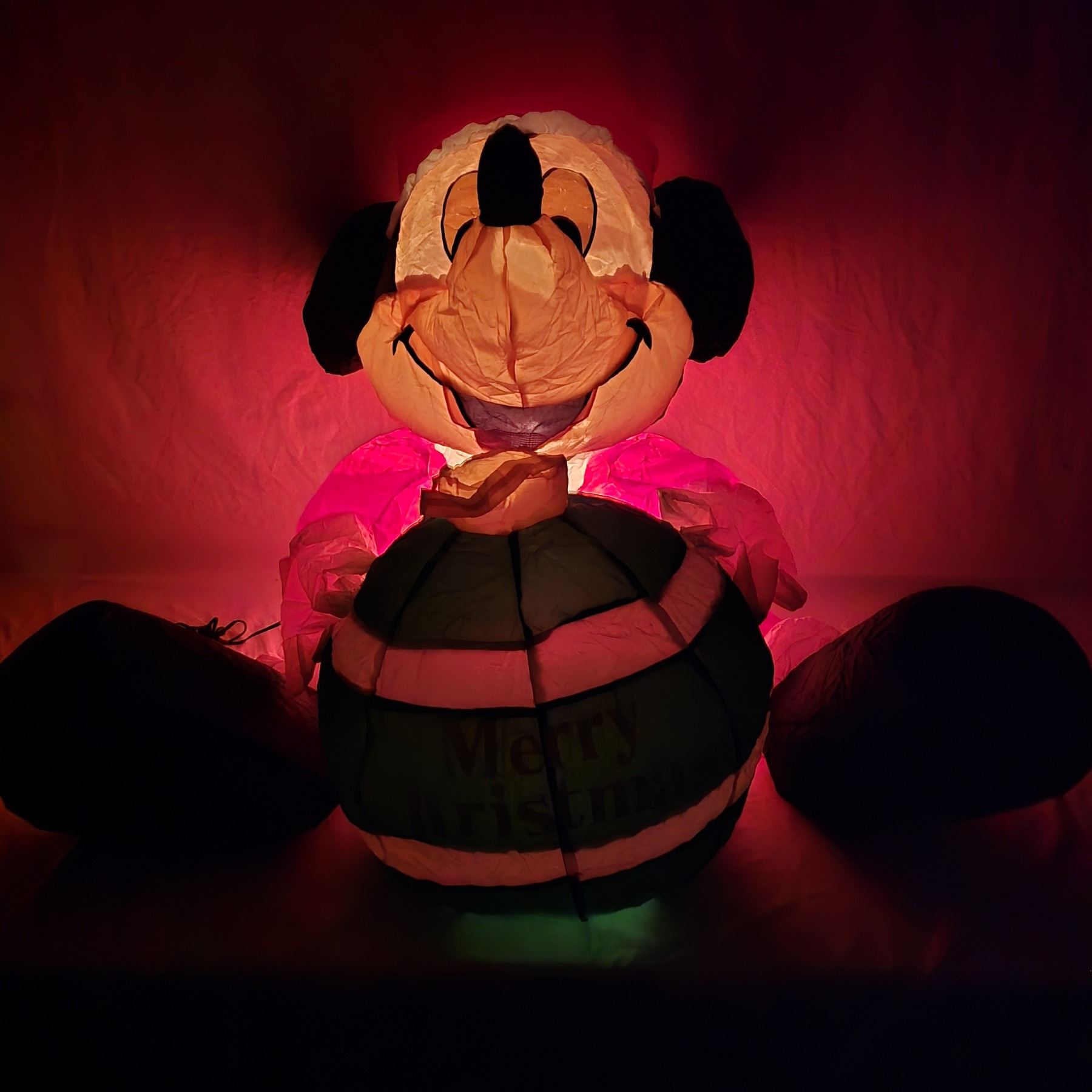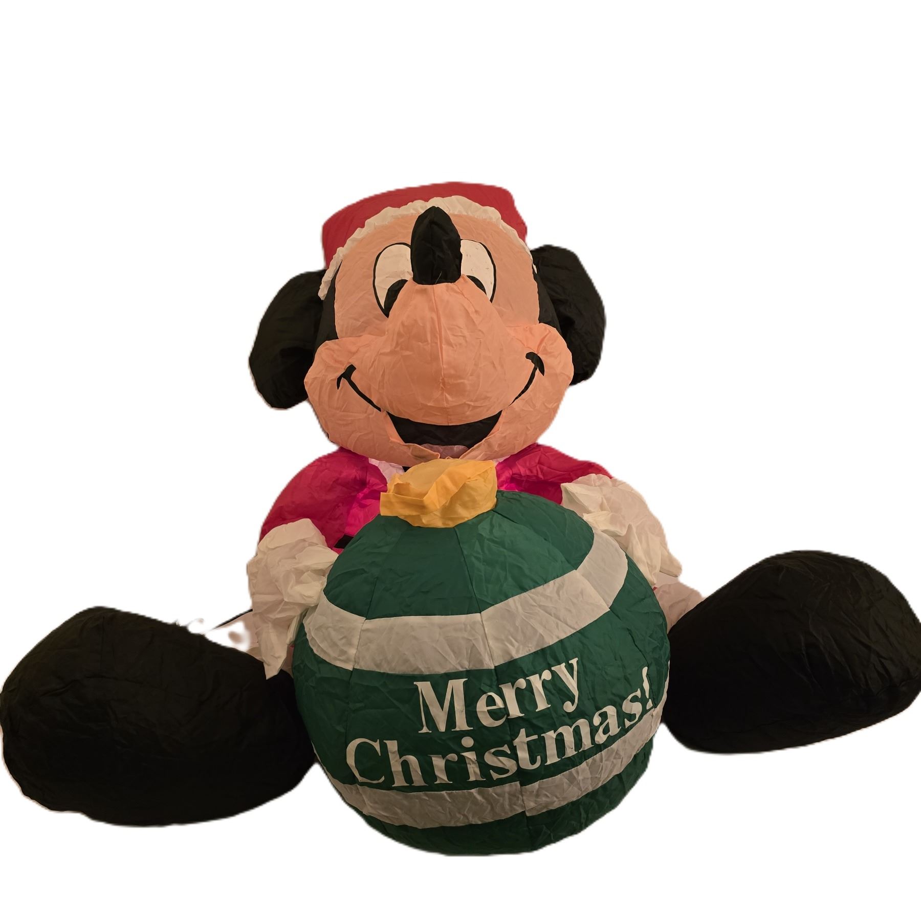 (Gemmy) This is a 3" airblown inflatible of a Santa Mickey seated holding a large Christmas Ornament. The fan and lights turn on. It is in good condition.