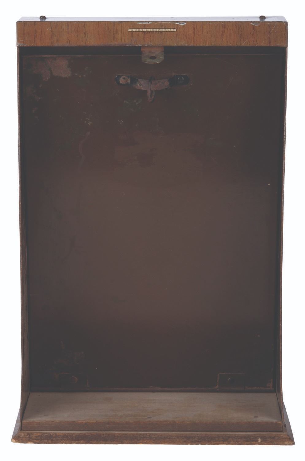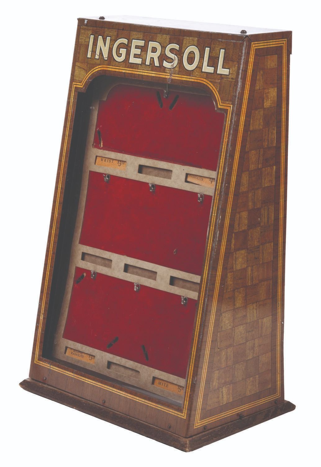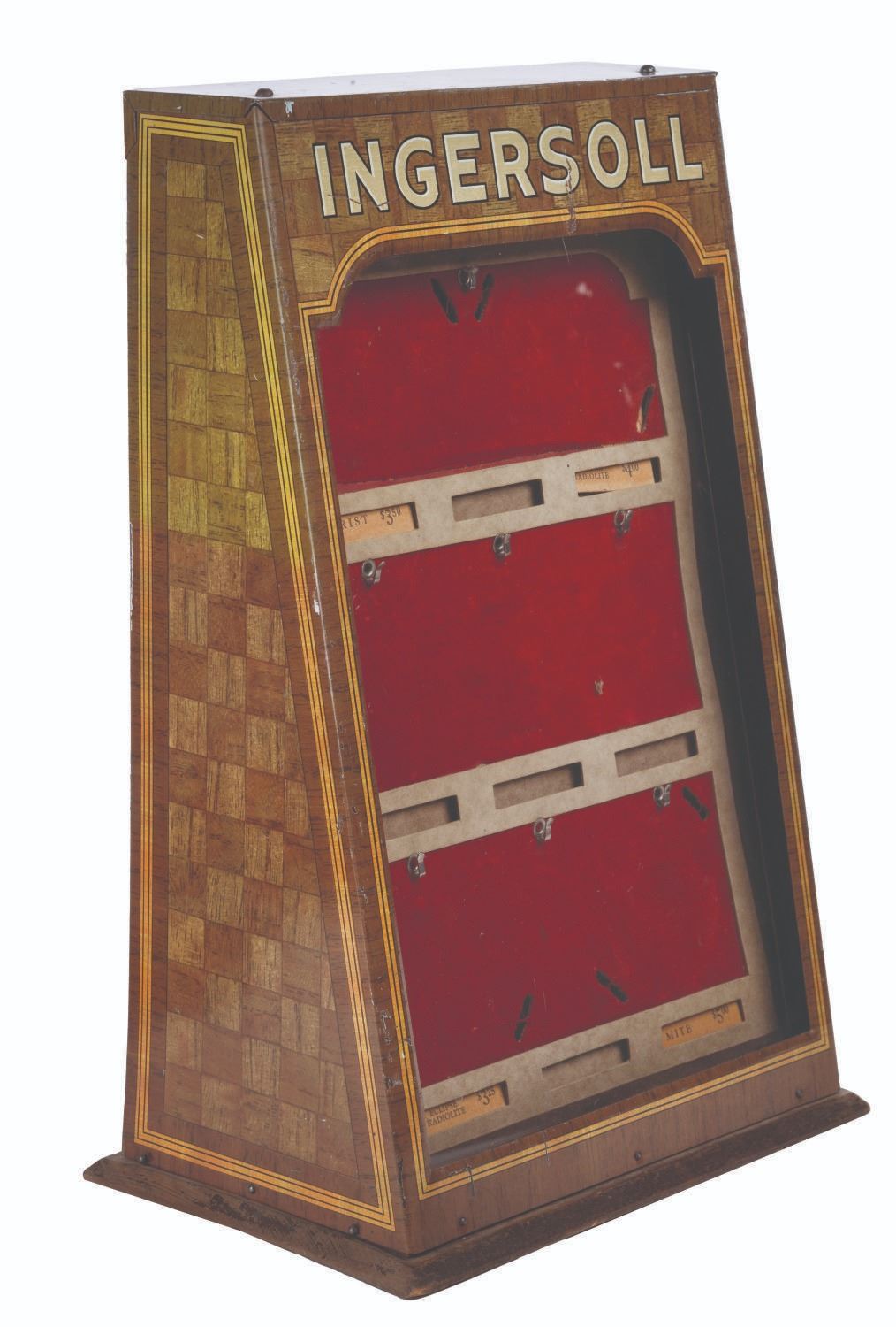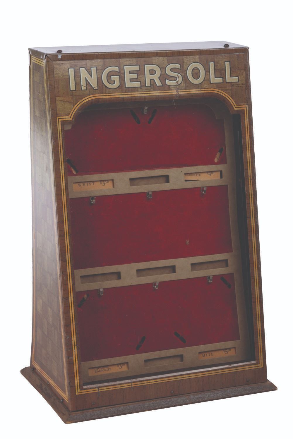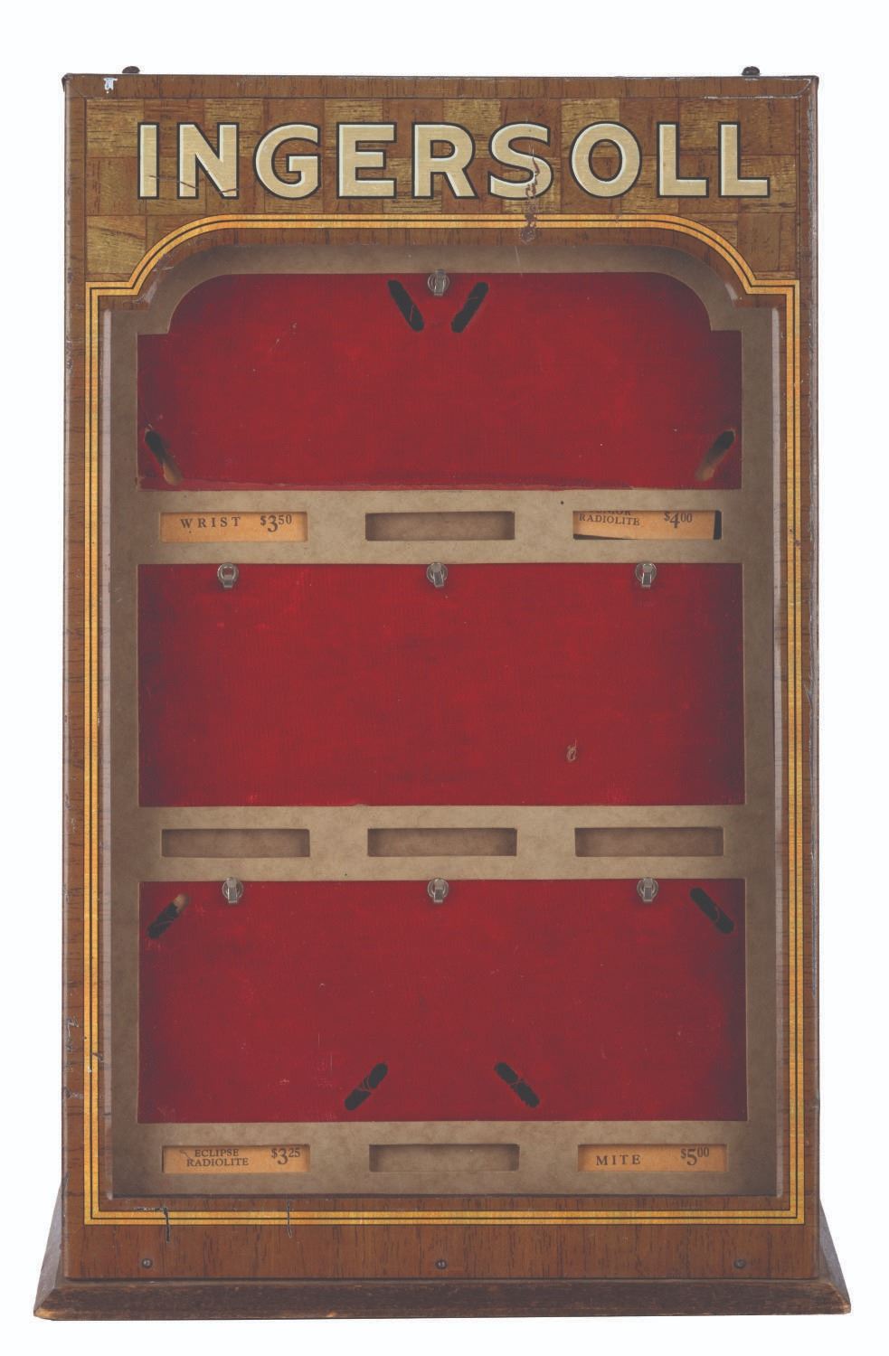 (Ingersoll, 1928-1929) A tin litho countertop display for Ingersoll watches. Ingersoll famously produced the first Mickey Mouse watches in 1933. This display has space for nine watches and includes six listing tabs with watch names and prices. One of these tabs is for the "Mite,” which is considered the predecessor of the Mickey Mouse watch. Measuring 9.5” x 14.5” x 6”, the display is in very good condition with light scratches, scuffs, wear, and discoloration on the interior.