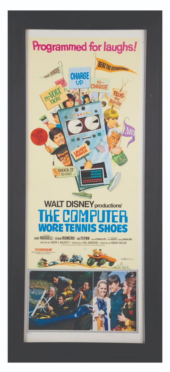 (Disney, 1969) An insert poster for the original theatrical release of "The Computer Wore Tennis Shoes.” Measuring 14” x 36” in an 18.5” x 40.5” frame, the poster is in good condition with creases throughout, light scuffs, and edge wear. The frame is in good condition with scuffs, scratches, and wear.