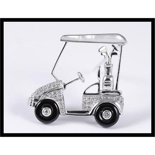 This interesting and sparkle 18K white gold "Golf Cart" brooch contains with a shell measures 13/15 inches long by 1/8 inches wide. 2 onyx are set as the wheel that measure 7mm. Also set are 37 diamonds that have an estimated total weight of 0.25 carats. This brooch weights 5.0 grams.