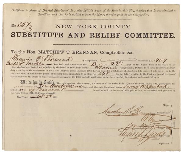 WILLIAM MARCY “BOSS” TWEED DS. 1 page. New York, October 2, 1863. “Frances P. Sherwood by occupation a ~…who has been drafted and adjudged by the Board of Enrollment…to be liable to perform military duty according to the requirement of the Act of Congress passed March 3, 1863, having provided a Substitute who has been duly mustered into the service in the place and stead of such drafted person…for the Relief provided by the Sixth Section of the Ordinance…The said applicant …is in indigent circumstances and has a family wholy depending on him for support…whose condition is such as to render it, in our opinion, a case in which said Substitute is entitled to have the sum of $300 paid to him…Substitute Lorenz Wippenbeck, of Bavaria P. An interesting view into the use of draft substitutes during the Civil War signed by one of America’s most notorious political figures. Fine.
