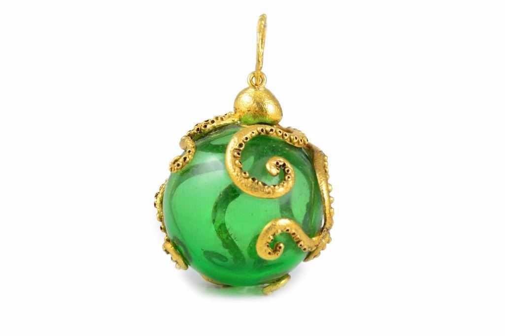 Designed as an amusing 18K gold octopus holding a green sphere, made of glass; pendant measures 1-1/2 inches; weight 52.8g.