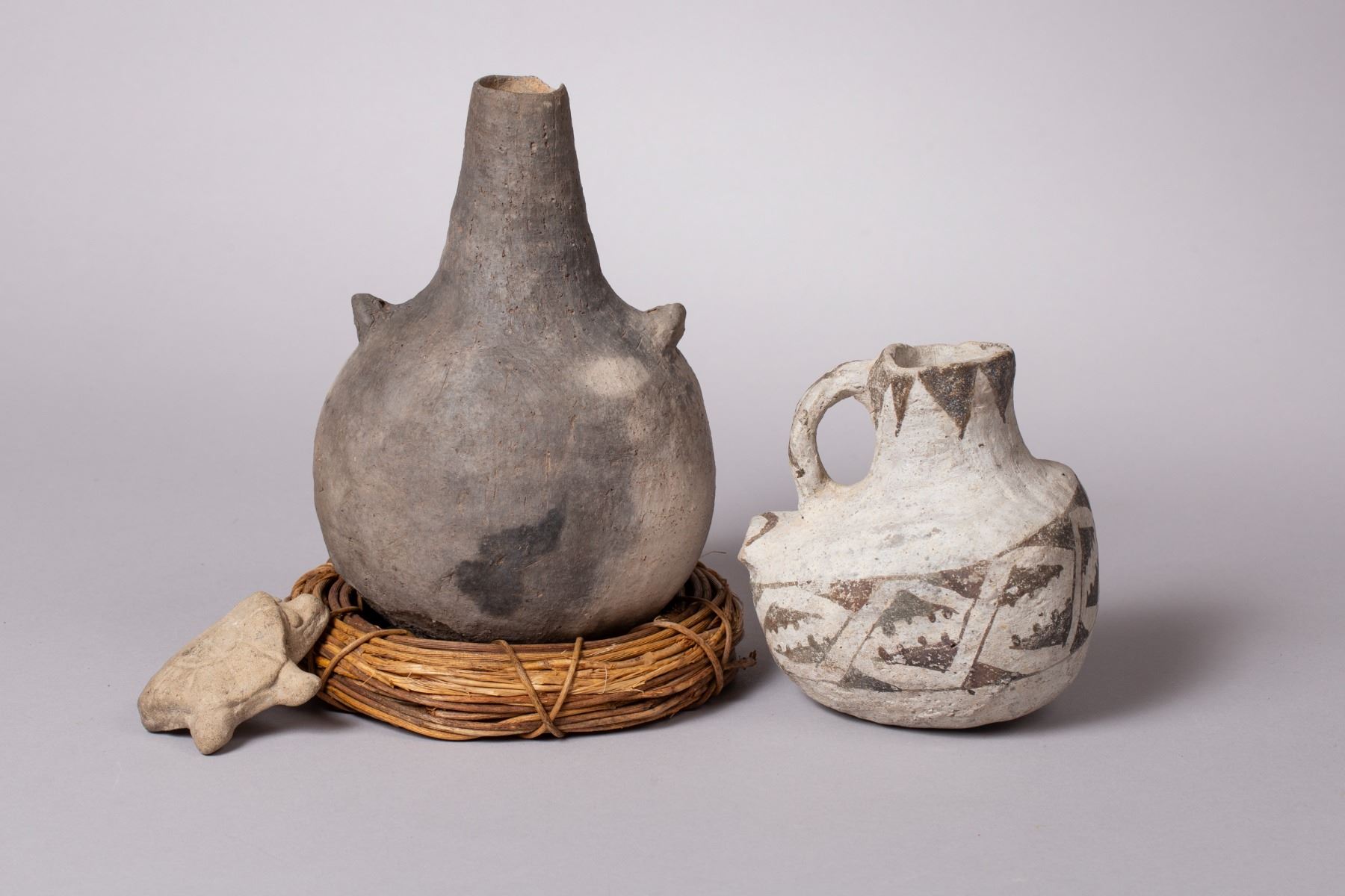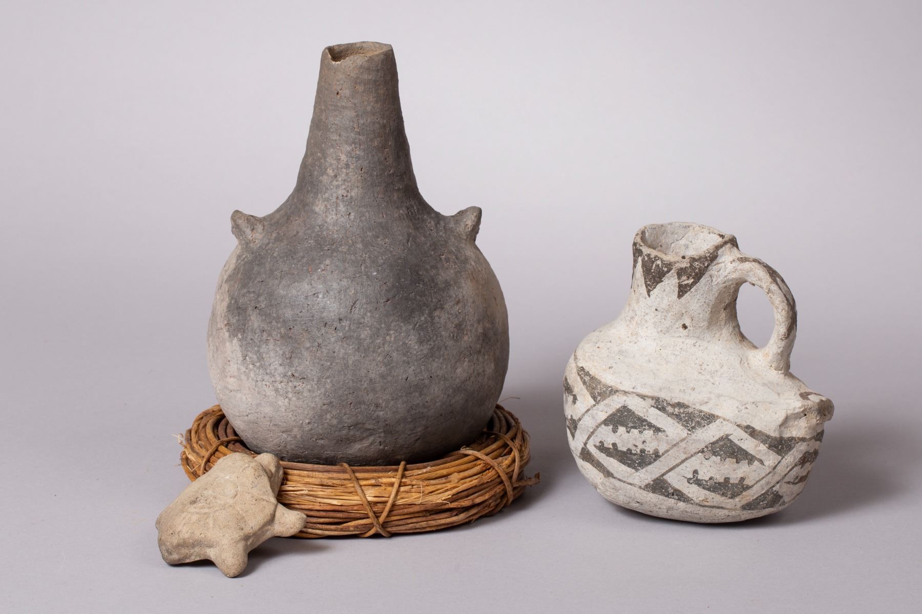 An Interesting Prehistoric Group of Anasazi Objects Including a Red Mesa Canteen, Duck Pitcher, and
