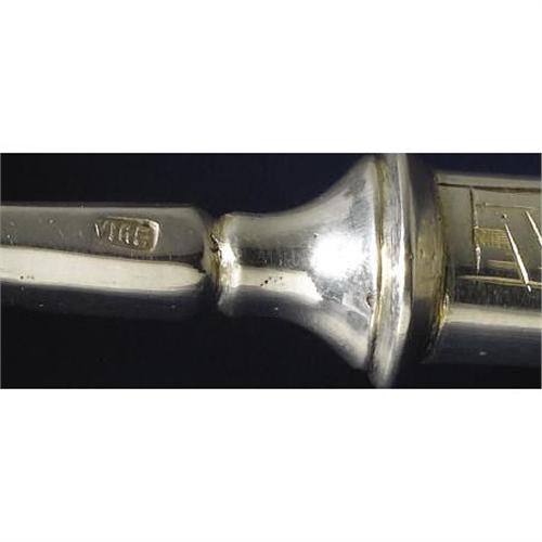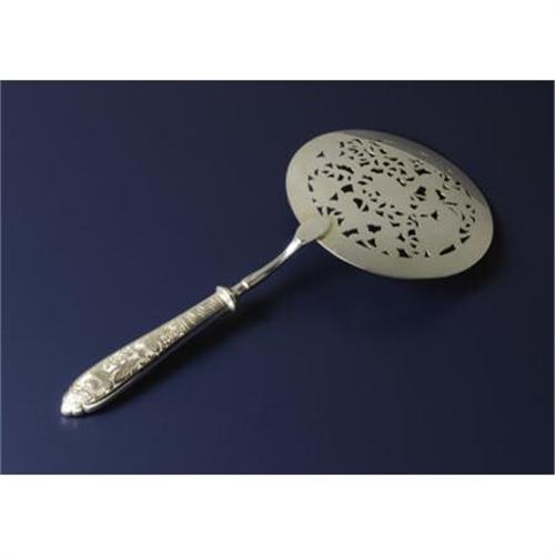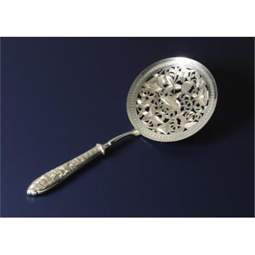<B>An Iranian Silver Pierced Server</B></I><BR>Unknown maker, Iran<BR>Twentieth Century<BR>Silver<BR>Marks: <I>VIGE</B></I><BR>9.5 inches long<BR>.18 Troy ounces<BR><BR>The bowl with pierced floral and scroll decoration, within engraved border; floral engraving to handle.<BR><BR><BR><BR><b>Shipping:</b> Requires 3rd Party Shipping (<a target="_blank" href="http://www.heritageauctions.com/common/shipping.php">view shipping information</a>)