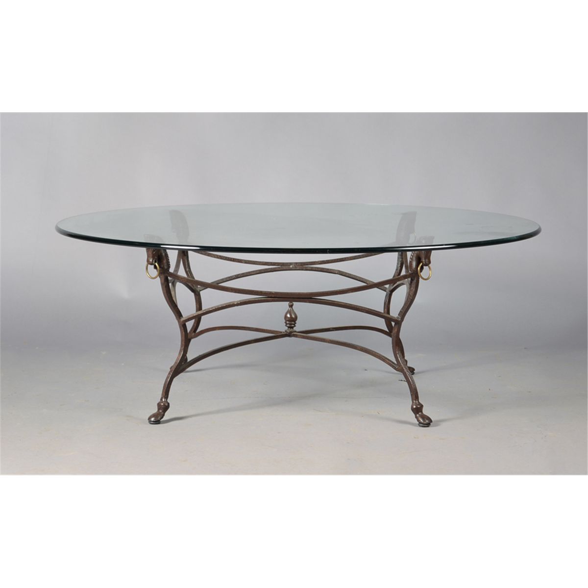 Iron base with horse head terminals with loose rings, with heavy circular beveled glass top, with arched stretcher and urn form finial. 17.75" H x 48" Dia. Circa mid 20th century. Private collection Mt. Christies Estates, Oxford, MI.