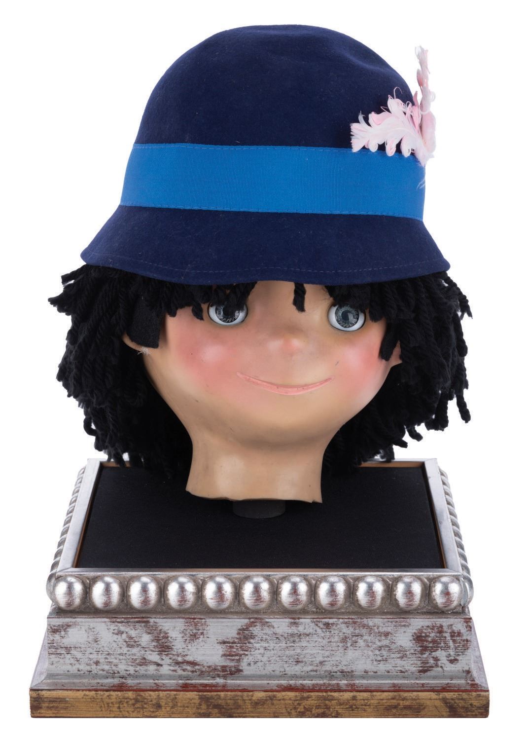 (Disneyland, 1990s) An Audio-Animatronics Figure Head from It's a Small World. The head includes the hand-painted and removable soft rubber latex skin over an empty plastic armature head structure. The head was likely removed during a rehabilitation of the attraction while the removable hair, blue hat with whimsical feather, and 10"x10.25" base, were created to complete a display of the head. The incredible piece measures 10" tall and 7.5" in diameter (and a complete 13" tall), and is in very good condition with scuffs, surface wear throughout, a small burn likely retained from "buttering" the flexible skin onto the figure with an iron during a rehabilitation, as well as detachment of the rubber and zipper on the back of the head.