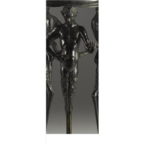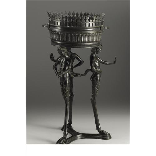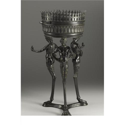 <B>An Italian Figural Bronze Jardiniere</B></I><BR><BR>Italian, after the antique from the Grand Tour<BR>Late Nineteenth Century<BR>Bronze<BR>Marks: Foundry mark for <I>Fonderia Sommer, Napoli</B></I><BR>19.5 in. high<BR><BR>The gadrooned jardiniere form with handles and supported by three satyr caryatids, each with one arm outstretched and the other akimbo1 <BR><BR><B>Condition Report:</B> Normal signs of wear as appropriate with age and loss