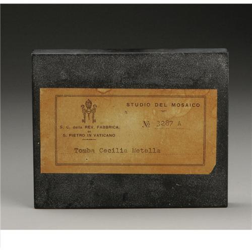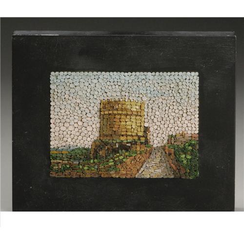 <B>An Italian Micro-mosaic Panel</B></I><BR><BR>Rome, Italy<BR>Twentieth Century<BR>Micro-mosaic<BR>Marks: with label in reverse from <I>Studio del Mosaico / S.C. della Rev. Fabbrica / S. Pietro in Vaticano</B></I><BR>4 in. x 4.75 in.(overall)<BR><BR>Depicting the classical <I>Tomba Cecelia Metella</B></I><BR><BR>Provenance:<BR>Walsh Family Art Trust<BR> <BR><BR><B>Important notice:<