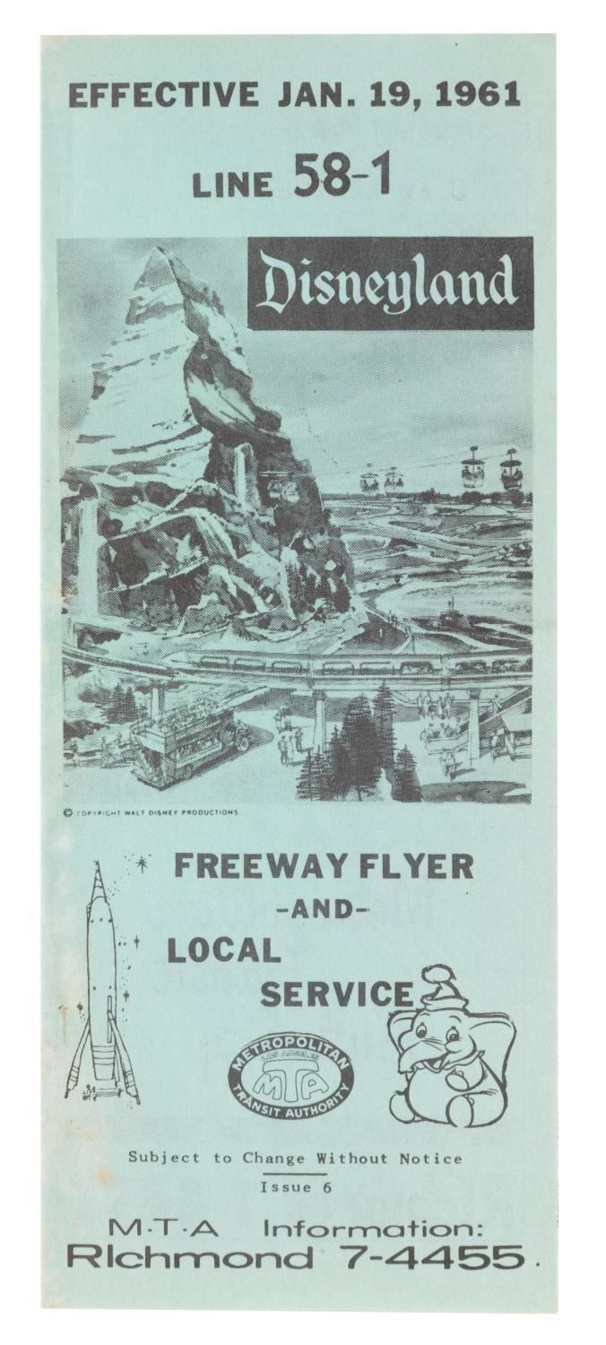 (Metropolitan Transit Authority, 1961) A 1961 flyer for the MTA Bus Line 58-1 serving Disneyland. Measuring 2.75" x 6.75" folded, the flyer is in good condition with light discoloration and edge wear to the left.