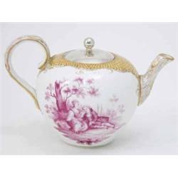 An Meissen bullet-shaped teapot, finely painted with pairs of lovers beside shrubs in puce enamel...