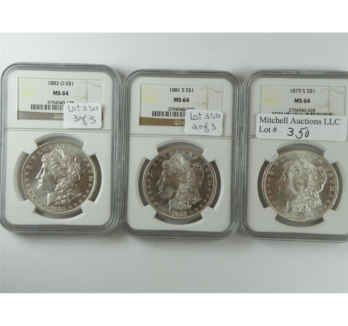 An NGC MS64 Morgan Dollar Trio: 1879-S, 1881-S, 1883-O. All offer vibrant lustre. The final coin is premium for the grade. A total of 3 pieces. Est.$180