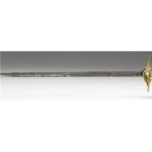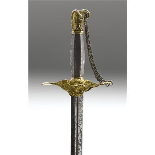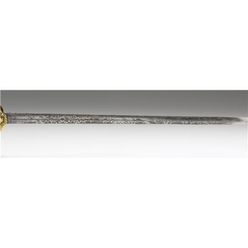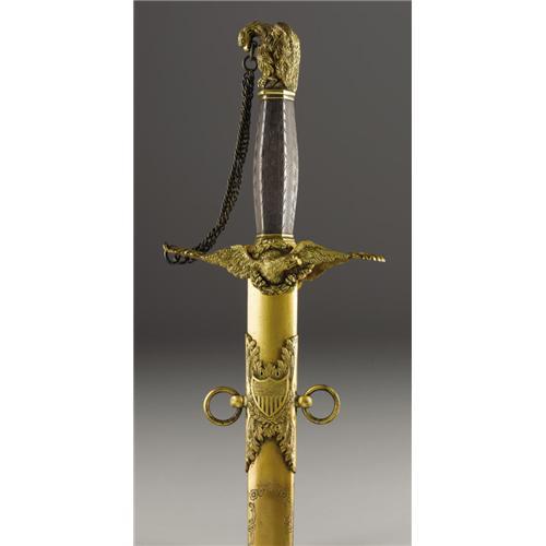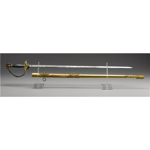 <B>An Officer's Presentation Sword with etched blade, presented to Lieutenant Alexander C. Layne of the Virginia State Guards, the "Stonewall Brigade" - Gettysburg to Lee's Surrender at Appomattox Court House.</B></I> This is a beautifully etched presentation blade by Ames Manufacturing Company, the most famous of American cutlers during the 19th century. It is silver-hilted with an eagle pommel and cross guard and a beautifully etched presentation blade inscribed as follows, "Presented to Lieut. A.C. Layne as a token of esteem by the members of the Virginia State Guards, Richmond, October 19, 1862." It is an extremely rare Ames etched presentation sword given to a Virginia officer who most certainly carried it throughout the Civil War when he served in the Virginia Confederate Light Artillery, Captain Montgomery's company.<BR><BR>Layne surrendered and was on the list of paroled prisoners of Cutshaw's Battalion when Lee surrendered the Confederate Army at Appomattox Court House. An absolutely superb sword with its original gilt scabbard, 31" straight double-edged etched blade, it is one of the finest Virginia presentation swords in existence. Layne was wounded during the Battle of Sharpsburg on September 17, 1862. In November of that year, he was in the line of battle near Ashby's Gap under the command of Lieutenant Sandy Pendelton. He marched with Stonewall Jackson's corps to join General Longstreet at Fredricksburg where his artillery, once again under the command of Sandy Pendelton, was engaged in battle. Several of the Virginia Light Artillery were wounded or killed in action. During the battle of Chancellorsville, they fired 750 rounds of ammunition under the command of General John Pegram.<BR><BR>On the morning of July 1, 1863, the Virginia Light Artillery marched for Gettysburg with Rhodes' division and joined the battle at one o'clock in the afternoon. The battery sustained heavy losses with thirty men killed or wounded that day. During the battle of Spotsylvania most of the battery was lost or captured, resulting in their reassignment to Fry's Battery under Major Cutshaw. The unit surrendered with Lee at Appomattox Court House on April 9, 1865. This is a remarkable and historically important sword carried by one of Virginia's finest. Complete with a research archive, the sword comes from the noted William Turner collection. <BR><BR>Authentication: Steve Hess.<BR><BR><b>Shipping:</b> Large Collectibles (<a target="_blank" href="http://www.heritageauctions.com/common/shipping.php">view shipping information</a>)
