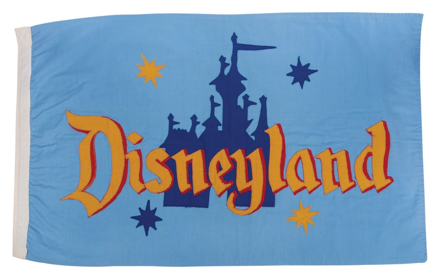 (Disneyland, 1955-80s) An official flag of Disneyland featuring the Sleeping Beauty Castle in bright, three-color embroidery. This style of flag was notably flown over the Main Street Station along the rails of the Santa Fe & Disneyland Railroad. Measuring 37.5"x23.5", the flag is in very good condition with some wear from Park display, handling, and age.