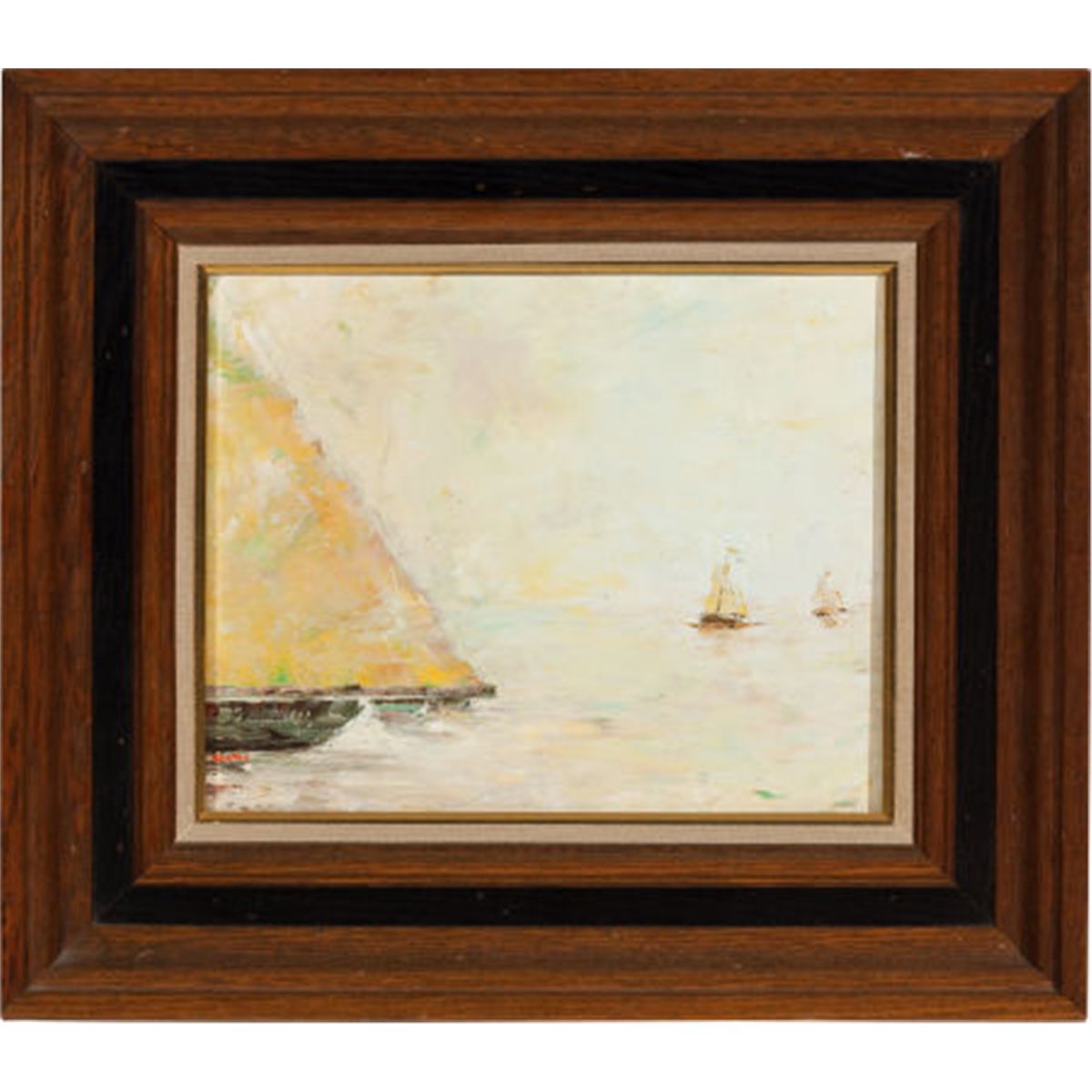 An Oil Painting, 1960s. Rendered on canvas, depicting three sailboats, signed in the lower left corner "Boopne."Framed: 13" x 15"; Work Only: 8" x 10"