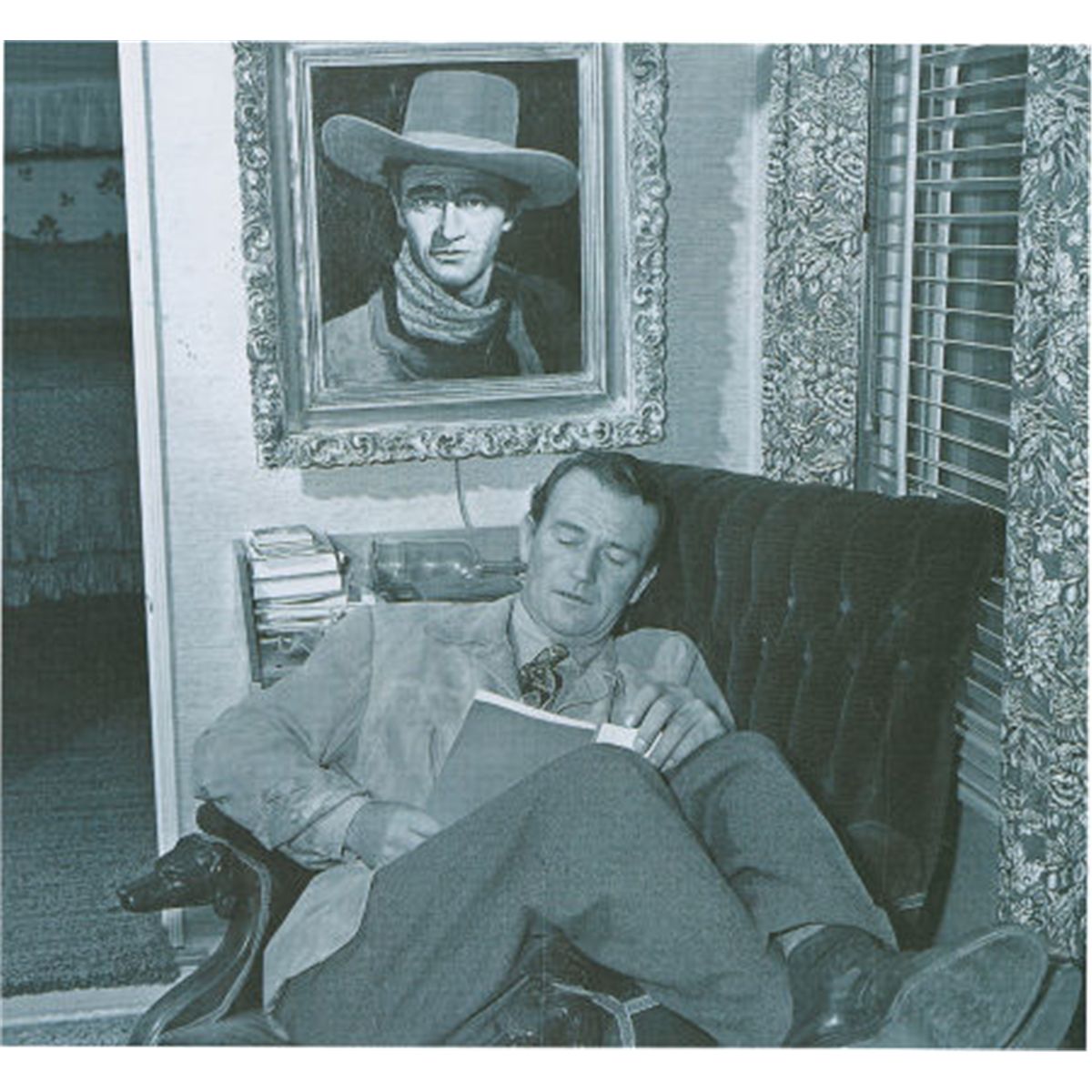 An Oil Painting by John Decker, 1945. Rendered on board, depicting Wayne in cowboy garb, signed in the lower left corner "John Decker 45" [the infamous Hollywood portrait artist and roustabout], in its original, elaborate wooden frame. (Please note the portrait needs to be professionally cleaned and the frame is somewhat damaged with missing pieces due to age.)Painting only: 21" x 18", Overall: 32" x 28"Wayne had this painting on display in his various homes for over thirty years.