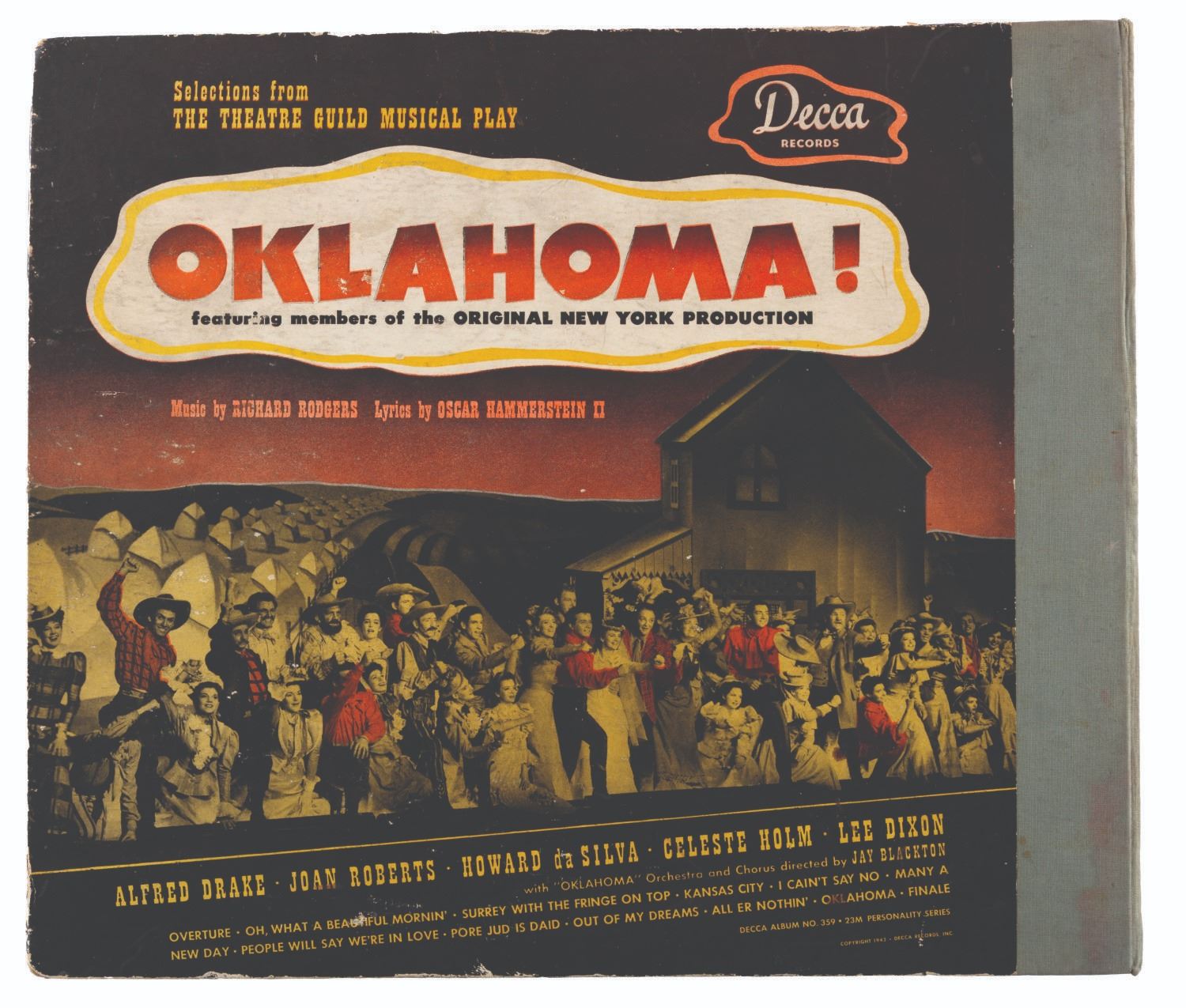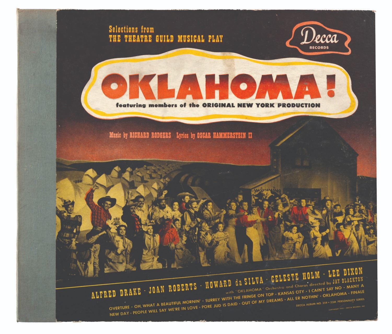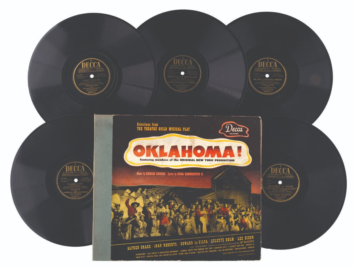 (Deca, 1943) An incomplete copy of “Okalahoma!” selections from the Rodgers and Hammerstein musical play featuring members of the original New York production. The album is presented in 12 sides of six 10” shellac 78 RPM records housed in paper jacket pages of an album and the record containing side 3 and 10 is missing from the set. The remaining records are fair, untested condition with light scuffs and scratches and signs of handling. The album is in good condition with moderate handling, shelf ware to the edges, and splits in the paper jackets.