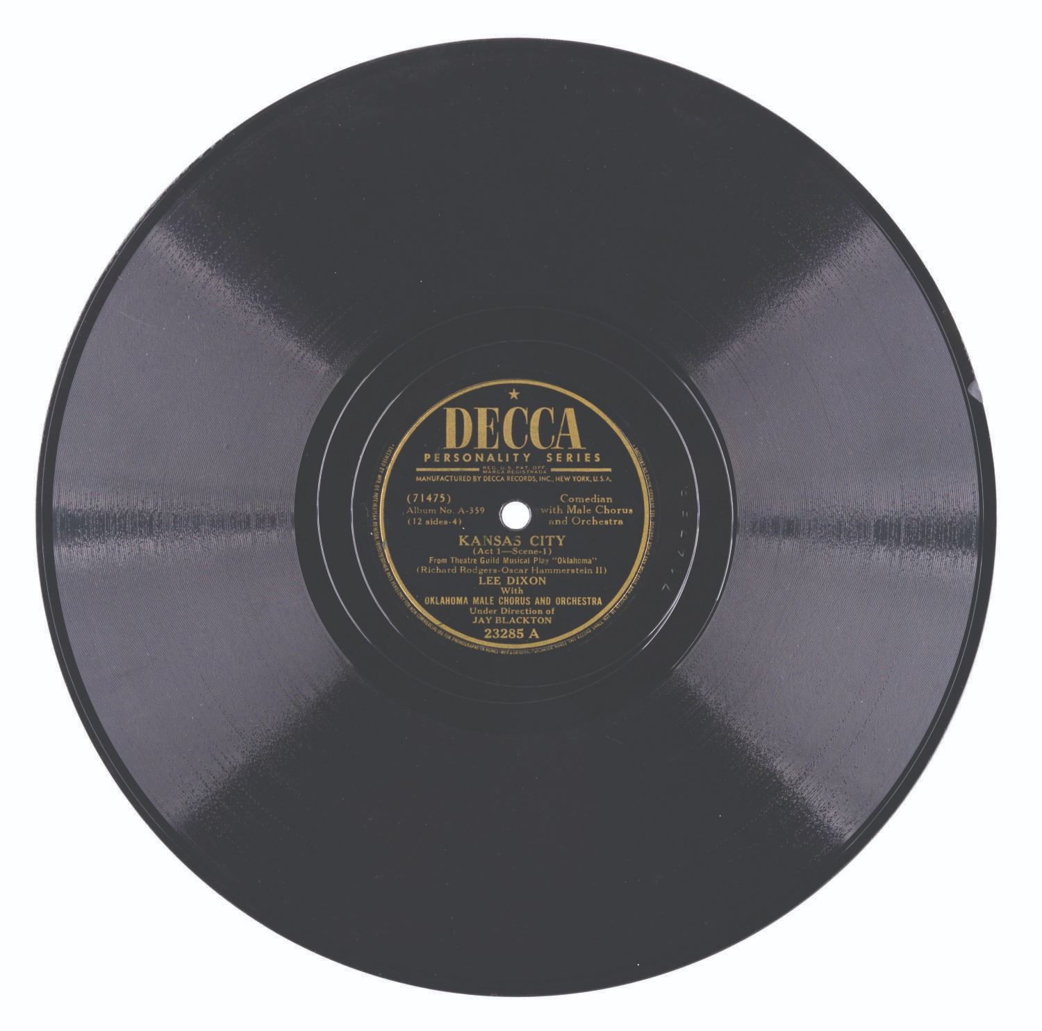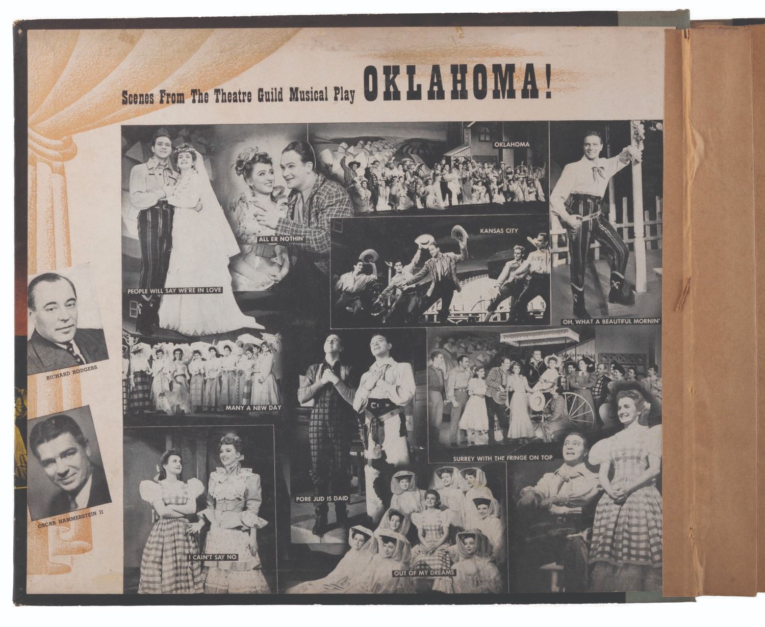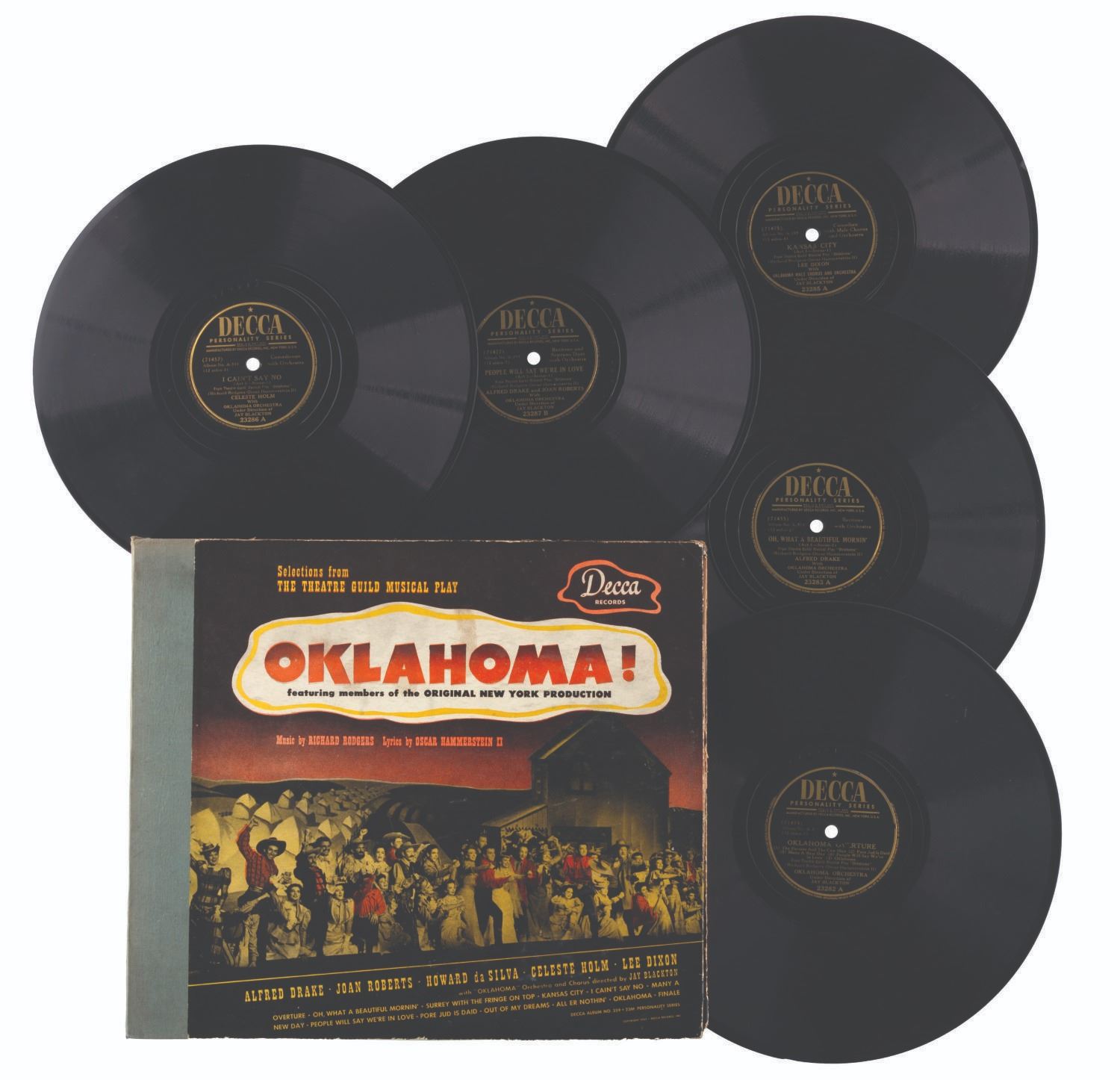 (Deca, 1943) An incomplete copy of “Okalahoma!” selections from the Rodgers and Hammerstein musical play featuring members of the original New York production. The album is presented in 12 sides of six 10” shellac 78 RPM records housed in paper jacket pages of an album and the record containing side 3 and 10 is missing from the set. The remaining records are fair, untested condition with light scuffs and scratches and signs of handling. The album is in good condition with moderate handling, shelf ware to the edges, and splits in the paper jackets.