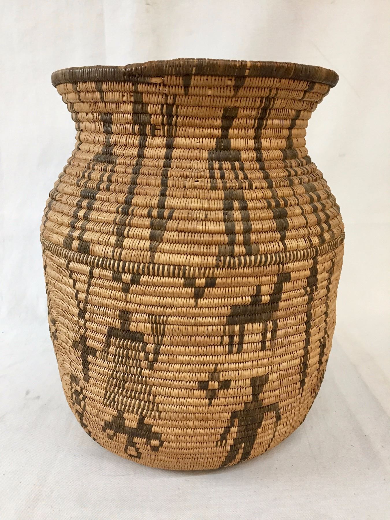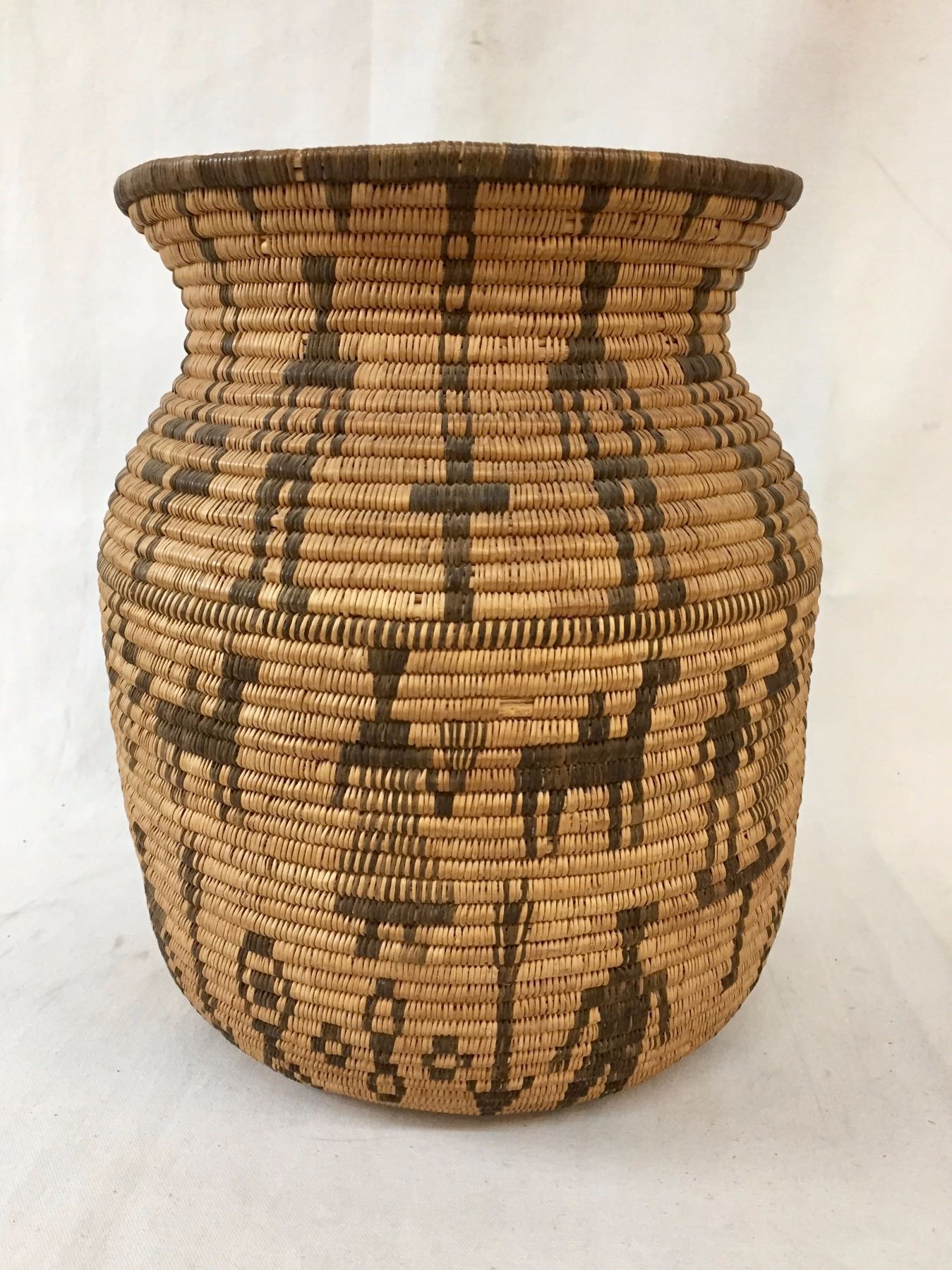 Description: This is a great, old, Apache Olla (basket) with numerous figures and designs. Maker: Unknown Apache Artist. Approx. Age: Circa 1890s. Size: 10”w x 12-1/4” tall. Condition: Pretty good for its age, normal wear and minor stitch loss expected. Please look closely at the pictures - they are an important part of our description. Shipping: There will be a $10 handling / packaging fee for shipping this lot. The actual cost of postage will be added on top of that.