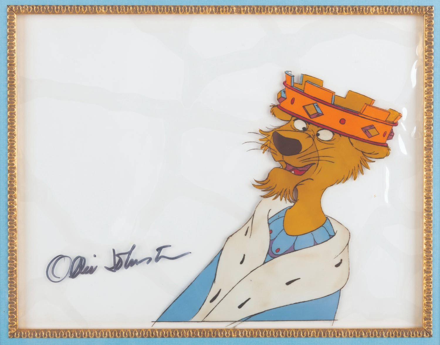 (Disney, 1973) An original production cel of Prince John from "Robin Hood,” signed by Disney Legend Ollie Johnston in black marker. Prince John has an image size of 6.5” x 6.75” on an 8.5” x 10.75” visible cel. The entire framed and matted piece measures 19.25” x 21.25”. The laminated cel is in fair condition with light stains, scratches, and typical heavy wear and waviness from the lamination process. The frame is in good condition with scuffs and wear.