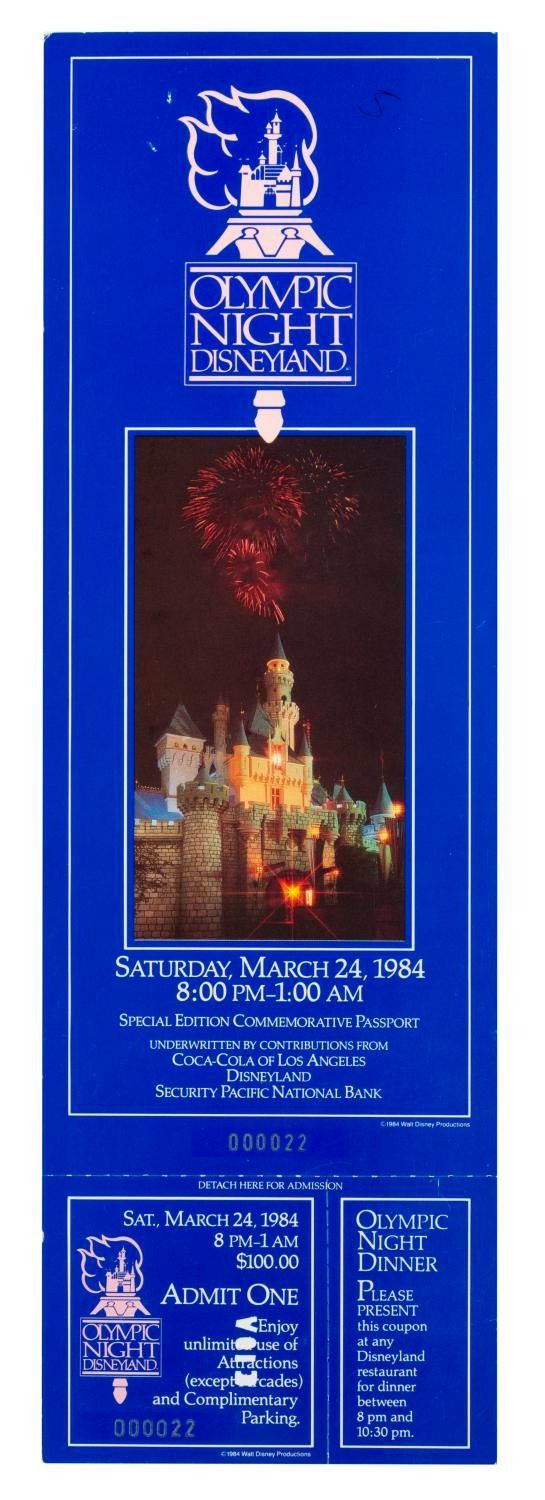 (Disneyland, 1984) A commemorative passport from Olympic Night at Disneyland, held at the Park in honor of the 1984 Summer Olympics in Los Angeles. The passport is numbered 000022 and punched "VOID." Measuring 4" x 12.5", the passport is in good condition with scratches, staple holes, an ink mark, edge wear, and discoloration from age on the reverse.