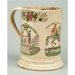 An Orange Order commemorative mug, of cylindrical form with turned foot and simple strap handle, printed in black and crudely coloured with enamels, bearing three Orange Order prints, "Let Brotherly Love Continue" (with initials GR), "Protestant Ascendancy - Holiness to the Lord", and an equestrian portrait of King William III, height 14.9cm, unmarked, circa 1830-50 (stained, cracks in body)