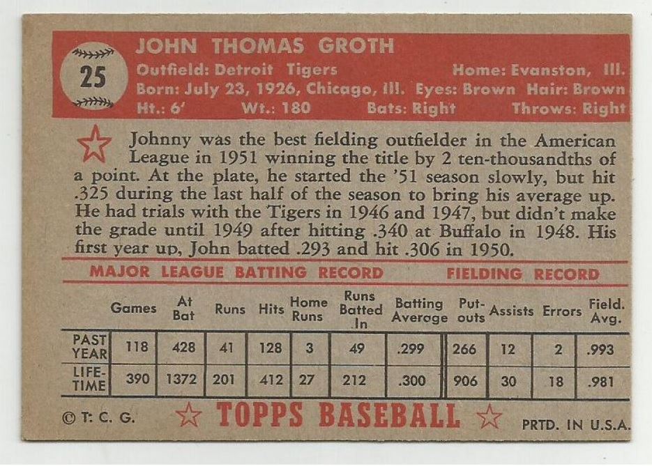 The very first Topps Baseball Card Set----1952 Topps. This is NOT a Reprint, but an Original Card #25 from the 1952 Topps Set. Check the scan on this beauty...it is in Excellent Condition!