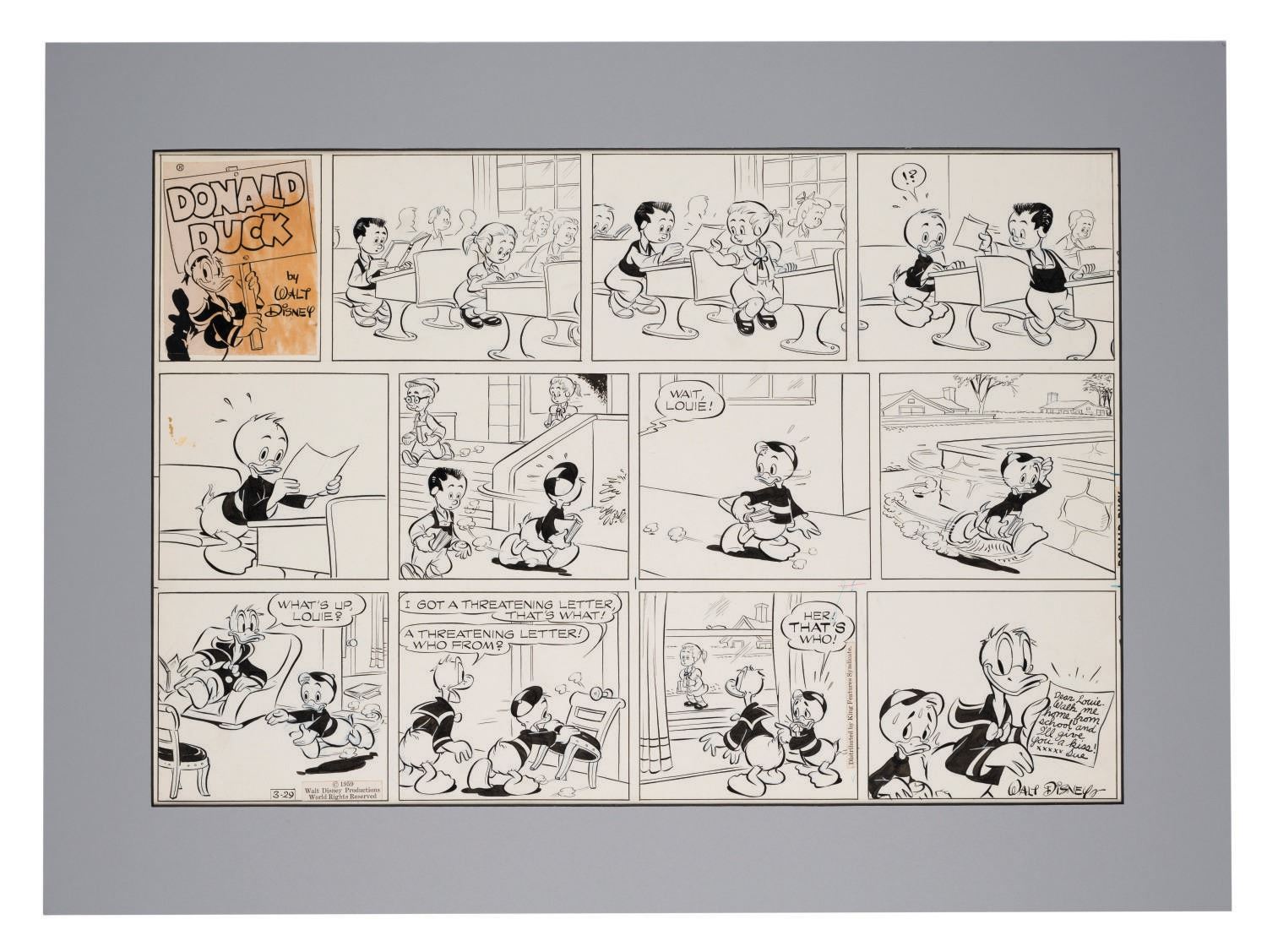 (Disney, 1959) An Original Donald Duck Sunday Comic Strip by Disney Legend Al Taliaferro. The original pencil and ink strip is dated March 29th, 1959 and has an image size of 14.5"x21.5" on 16.5"x23" paper. Originally sold at the Disneyana shop at Disneyland, the strip is in very good condition with expected wear from age.