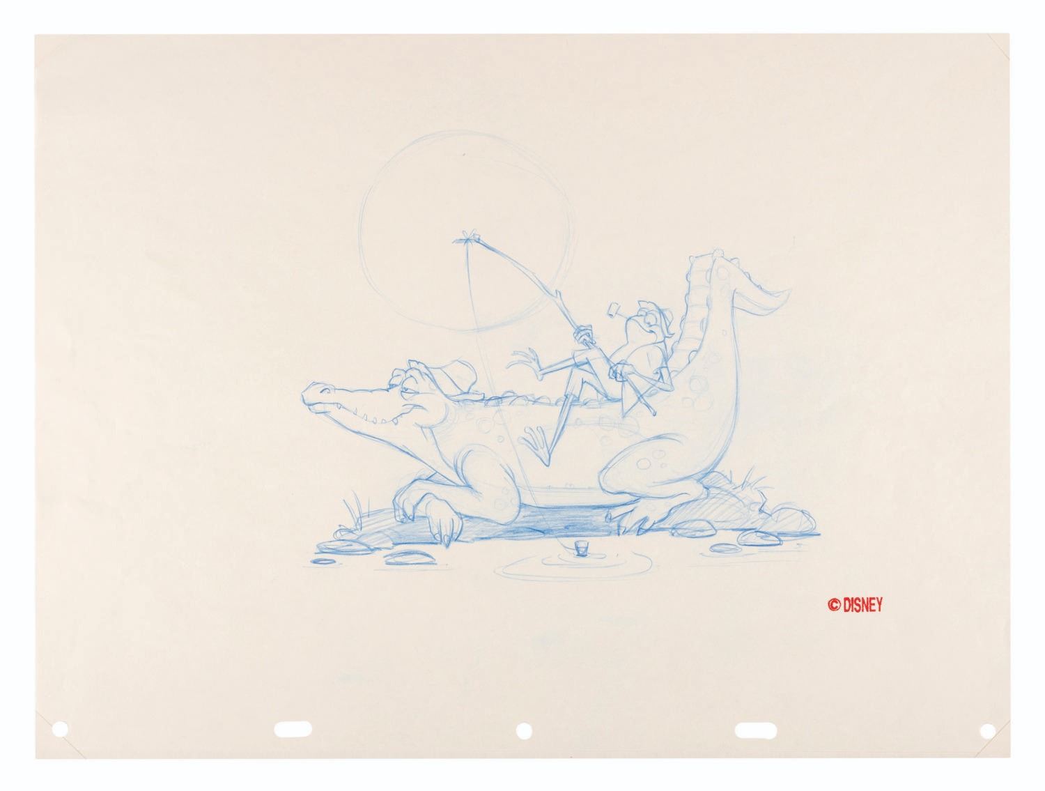 (Disneyana, 1990s) A drawing of the Brer Frog character popularized by both Walt Disney's Song of the South" and Splash Mountain, created by an animation intern at Disney Consumer Products. The piece has an image size of 9.25"x8" on its untrimmed 17"x12.5" animation paper and is in very good condition exhibiting light wear from handling and age.