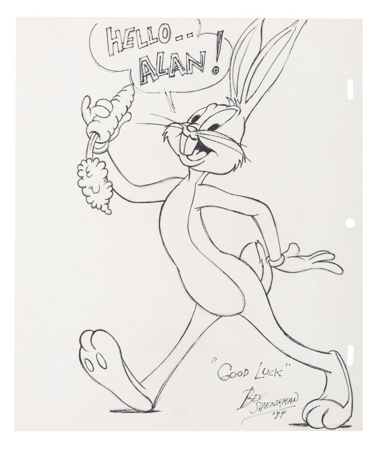 (Shenkman, 1984) An original Bugs Bunny drawing by animator Ben Shenkman, dedicated to Alan Hylton. Accomplished in pencil and ink, the 12.5” x 8.25” image nearly fills the 12.5” x 10.5” animation paper, and is in very good condition.