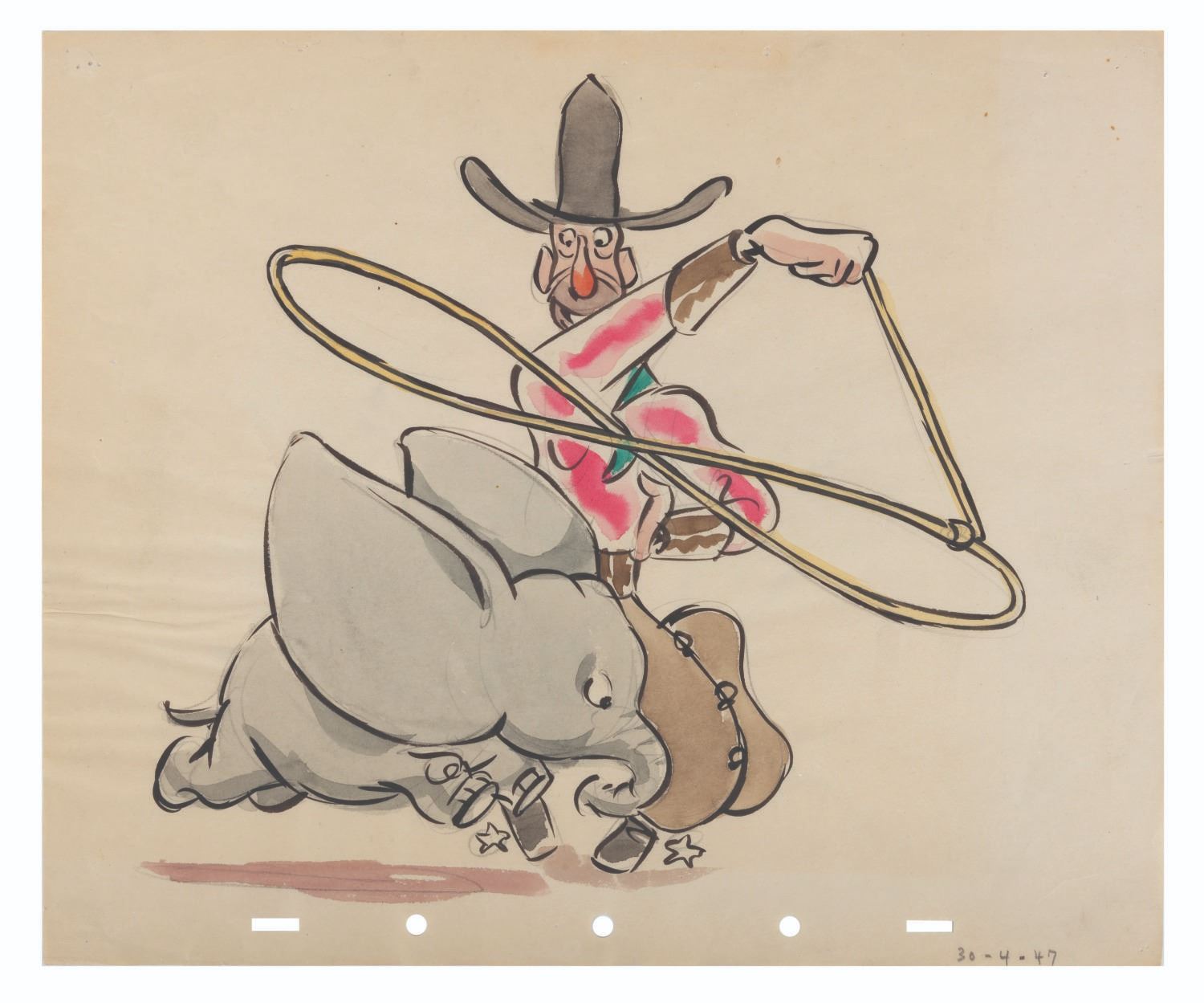 (Disney, 1941) An original concept painting featuring Dumbo and a clown created for Walt Disney's 1941 film, "Dumbo." The artwork is accomplished in water-based inks and paints and has a total image size of 9.5"x8.5" on untrimmed 12"x10" animation paper. In very good condition exhibiting some creases, pinholes, and expected wear from production and age.