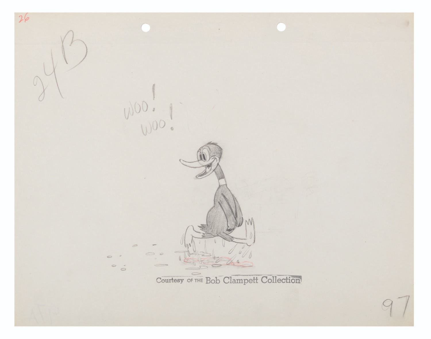 (Schlesinger, 1937) An original production drawing of Daffy Duck from his debut appearance in the Looney Turns short “Porky’s Duck Hunt.” Even in this early storyboard drawing, Daffy’s zany hyperactivity is unmistakable. The character’s popularity grew, eclipsing Porky to become one of the most popular cartoon characters in the world to this day. Accomplished in graphite with a character image size of 2.25” x 3.75” on 9.5” x 12” animation paper, the drawing is in good condition, stamped “Courtesy of the Bob Clampett Collection,” with edge wear and creasing, a horizontal fold 1” from the top edge that runs the width of the paper, and light discoloration from age.