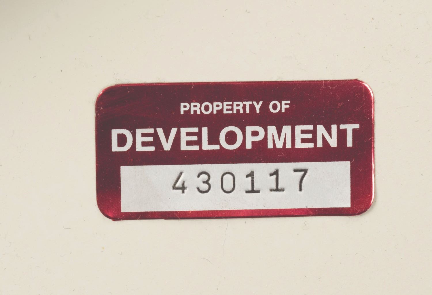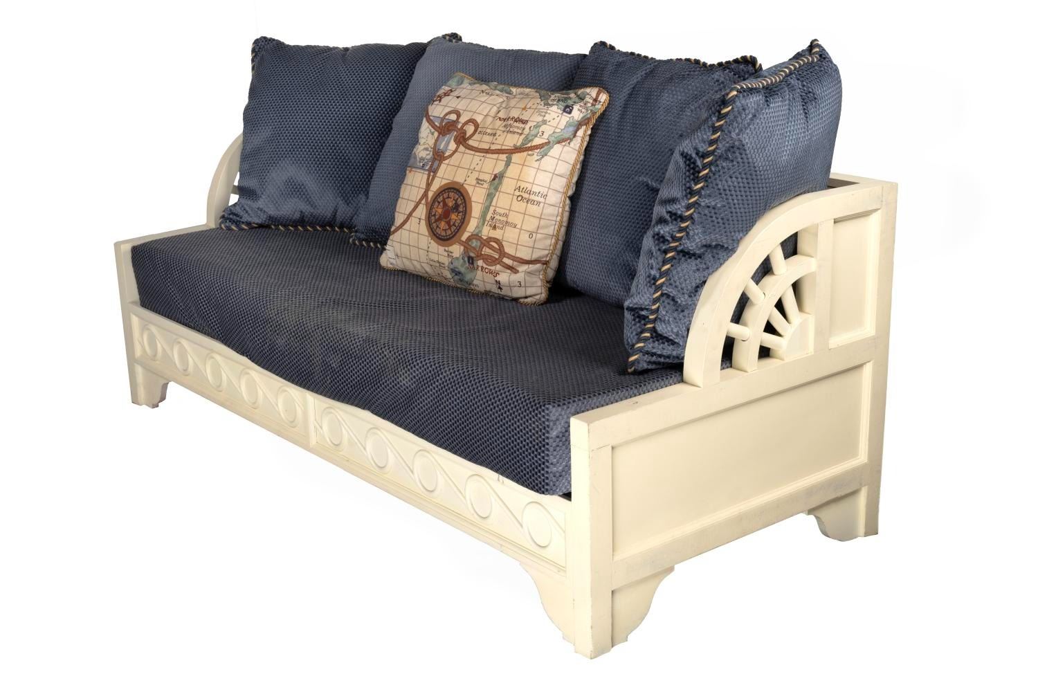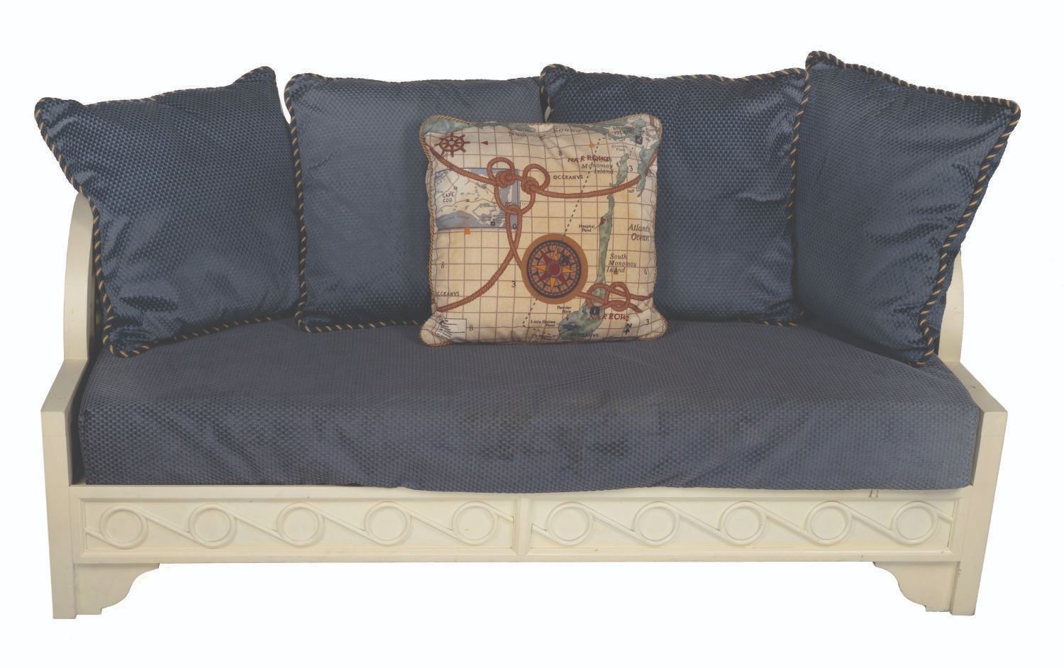 (Disney’s Yacht Club, 2010s) A Disney’s Yacht Club Resort Suite Couch. This furniture design has a nautical theme with helm accents inspired by 1880s seaside resorts like Martha’s Vineyard and Nantucket Island. The couch comes with its original (4) matching pillows and (1) pillow featuring a Nantucket map-themed motif with "hidden Mickey" sailing knots. This piece was removed during a previous repair of a suite or by the Resort’s complete refurbishment during late 2017. This furniture is of particleboard and wood construction with cushions and pillows, and retains a Property of Development label numbered "430117." The original seat cushions have been wrapped in matching textile fabric. Measuring 76"x32.5"x30", the furniture is in good condition with scuffs, scratches, spots of discoloration, and wear to the textile, wood, particleboard and hardware elements from Guest use.