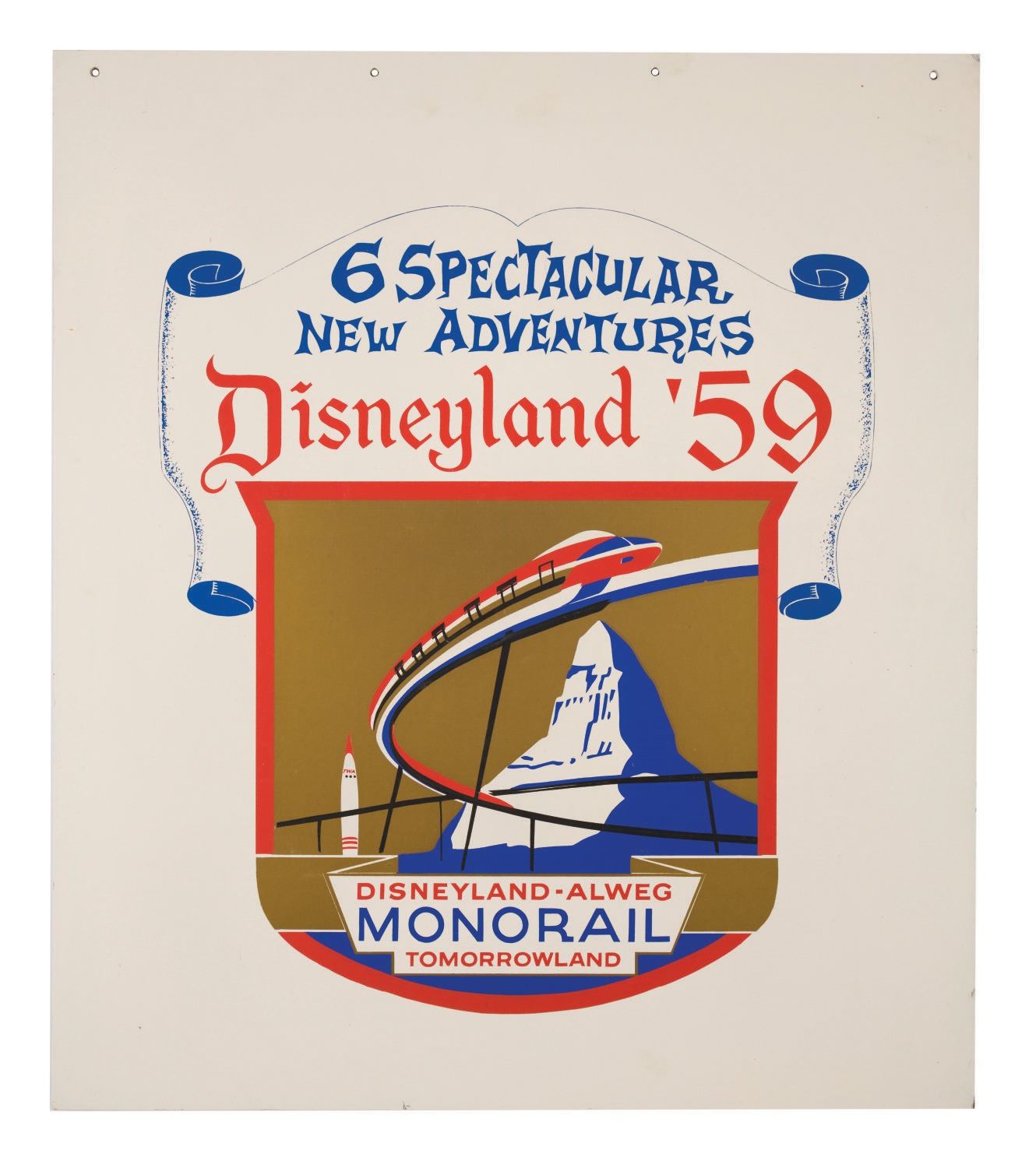 (Disneyland, 1959) An original silk-screened lamppost sign announcing the Disneyland-ALWEG Monorail and "spectacular new adventures" at Disneyland. Signs like this were hung over Main Street and on lampposts during the opening of new attractions at Disneyland in 1959. Measuring 26.5"x30", the silk-screened piece is in very good condition, despite the slightest scuffs and wear to painted areas, edges, and corners.
