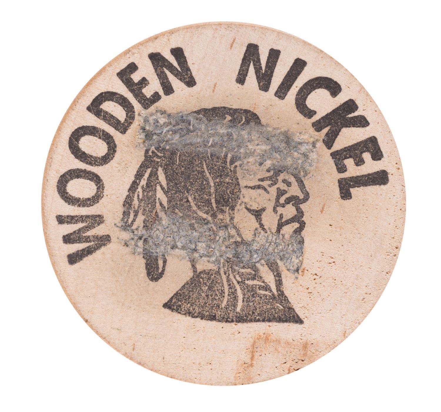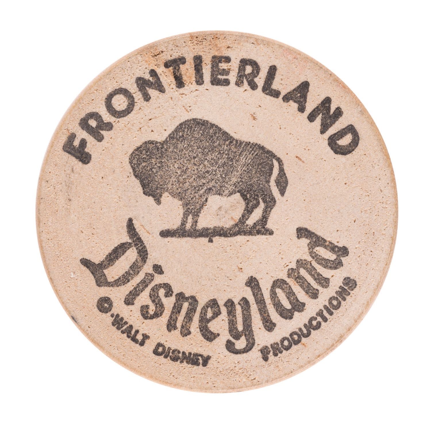 (Disneyland, 1970s) A Disneyland Souvenir Wooden Nickel. While wooden nickel collecting has become a trend in recent years through Disneyland Resort and Walt Disney World, this souvenir was originally offered in relation to the Indian Village area of Frontierland at Disneyland. Measuring 1.5" in diameter, this souvenir is in good condition with scuffs and scratches to surfaces and imagery.