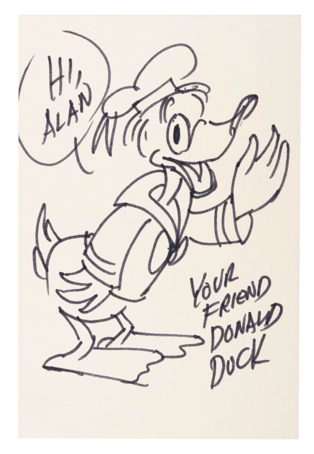 (Walt Disney Studios, 1979) An original drawing of Donald Duck by story artist Leo Salkin. Accomplished in ink on thin art paper, the drawing is personalized with Donald saying "Hi, Alan" and signed by Salkin as "Your Friend Donald Duck." Measuring 6"x4", the drawing is in very good condition.