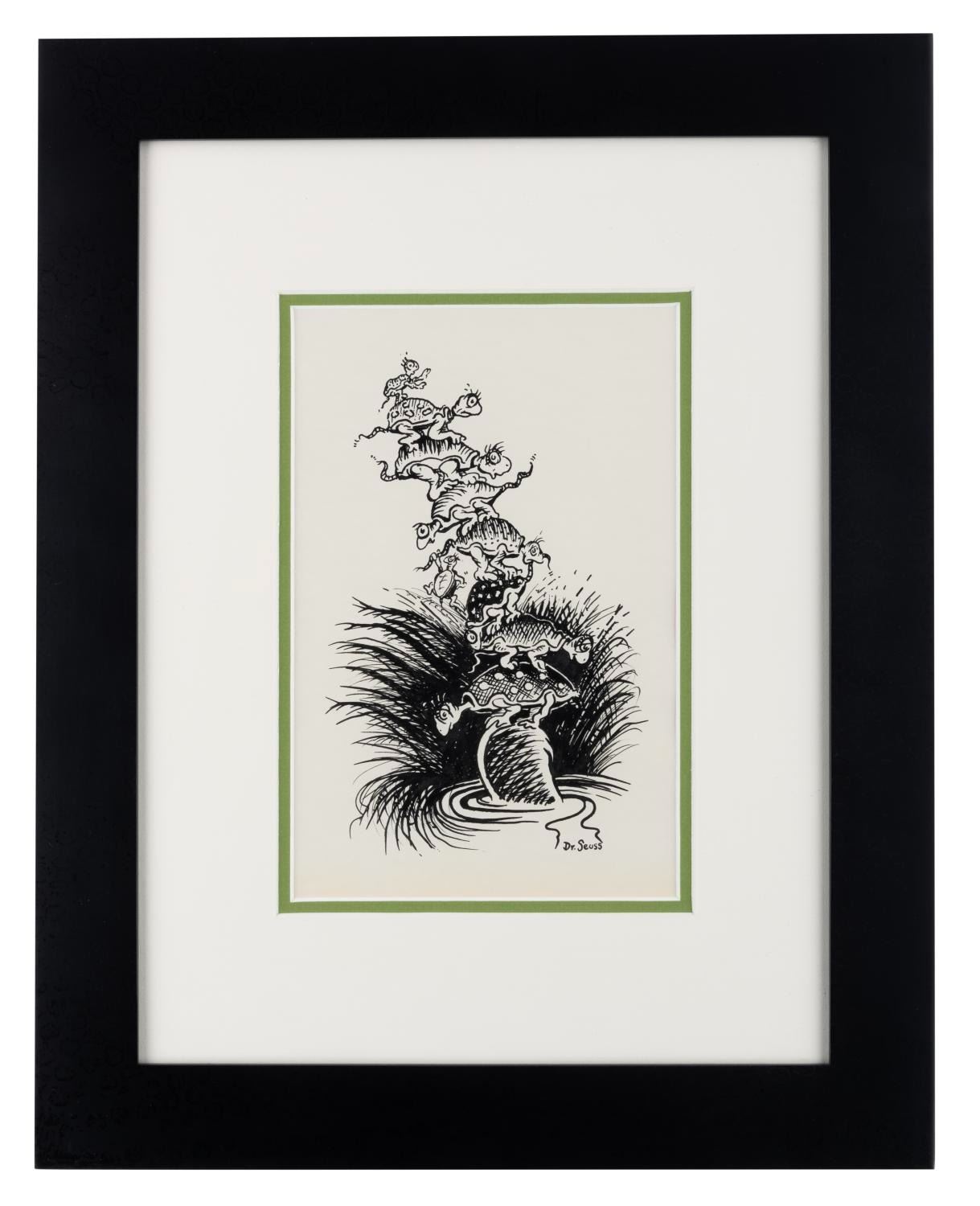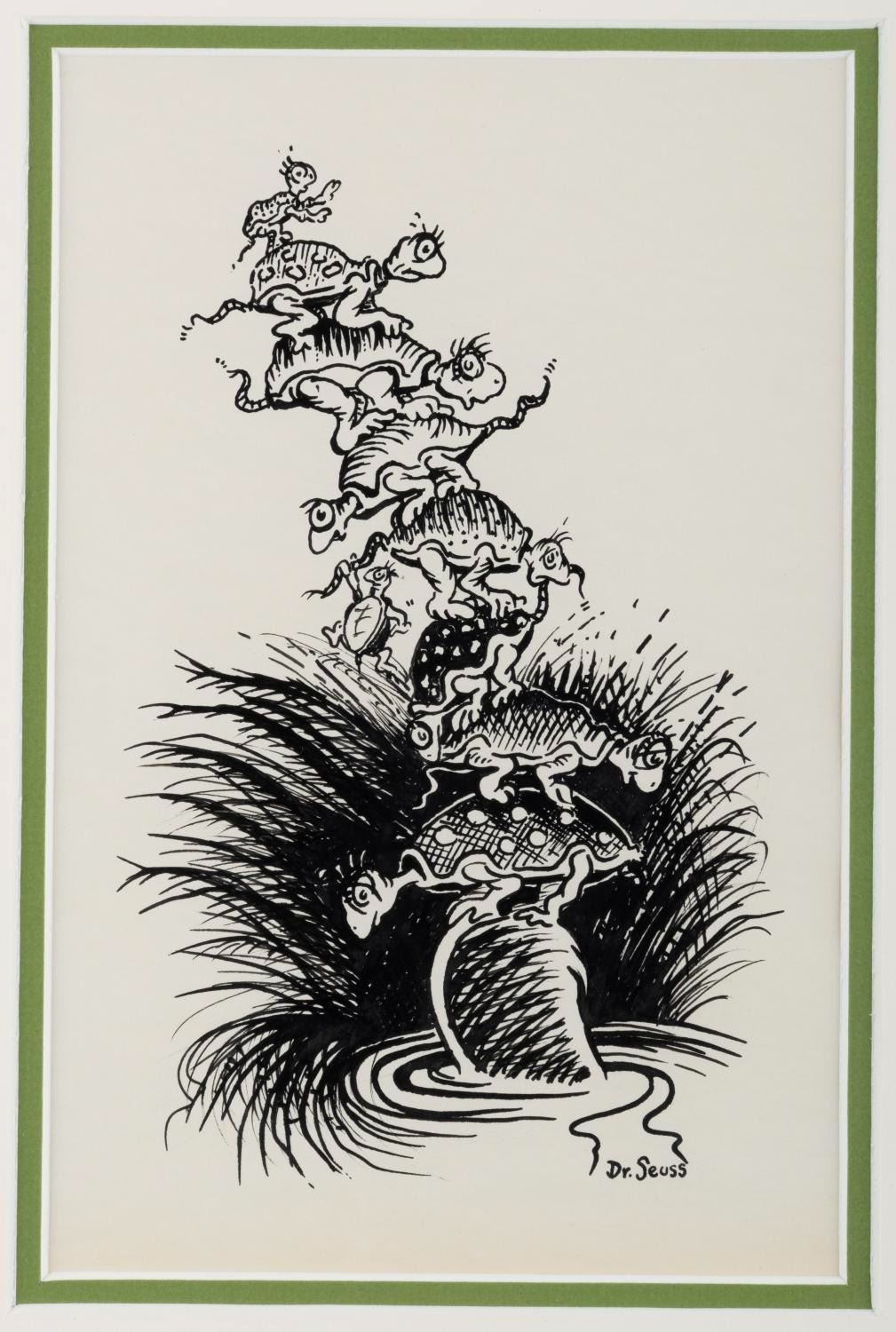 (Dr. Seuss, 1980s-90s) An original Yertle the Turtle drawing signed by Dr. Seuss. The ink drawing measures 5.5" x 8.5" on 6.5" x10" visible illustration paper in a 15" x 19" frame. The drawing is in fine condition, while the frame is in very good condition with light wear from storage.